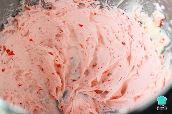 Seguidamente acrescente duas colheres de sopa do purê de morango e a essência e misture. Adicione o restante açúcar de confeiteiro, duas colheres de purê de morango, e repita até obter uma ganache cremosa.