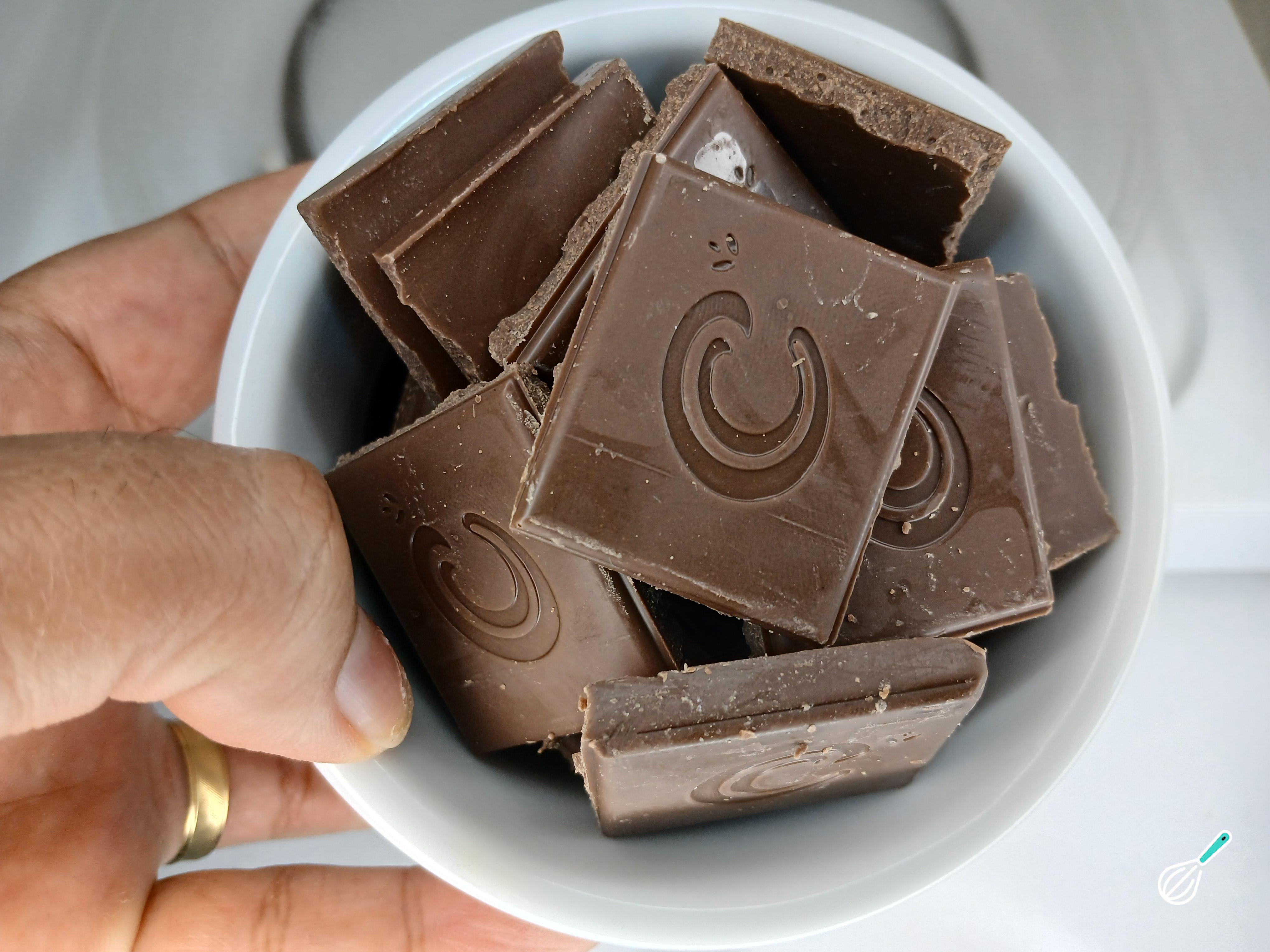 Dica: Esse processo poderá ser feito no fogo. Coloque o chocolate em um recipiente de vidro ou alumínio e coloque sobre uma panela com água. Então em fogo baixo, vá derretendo o chocolate aos poucos, misturando bem.