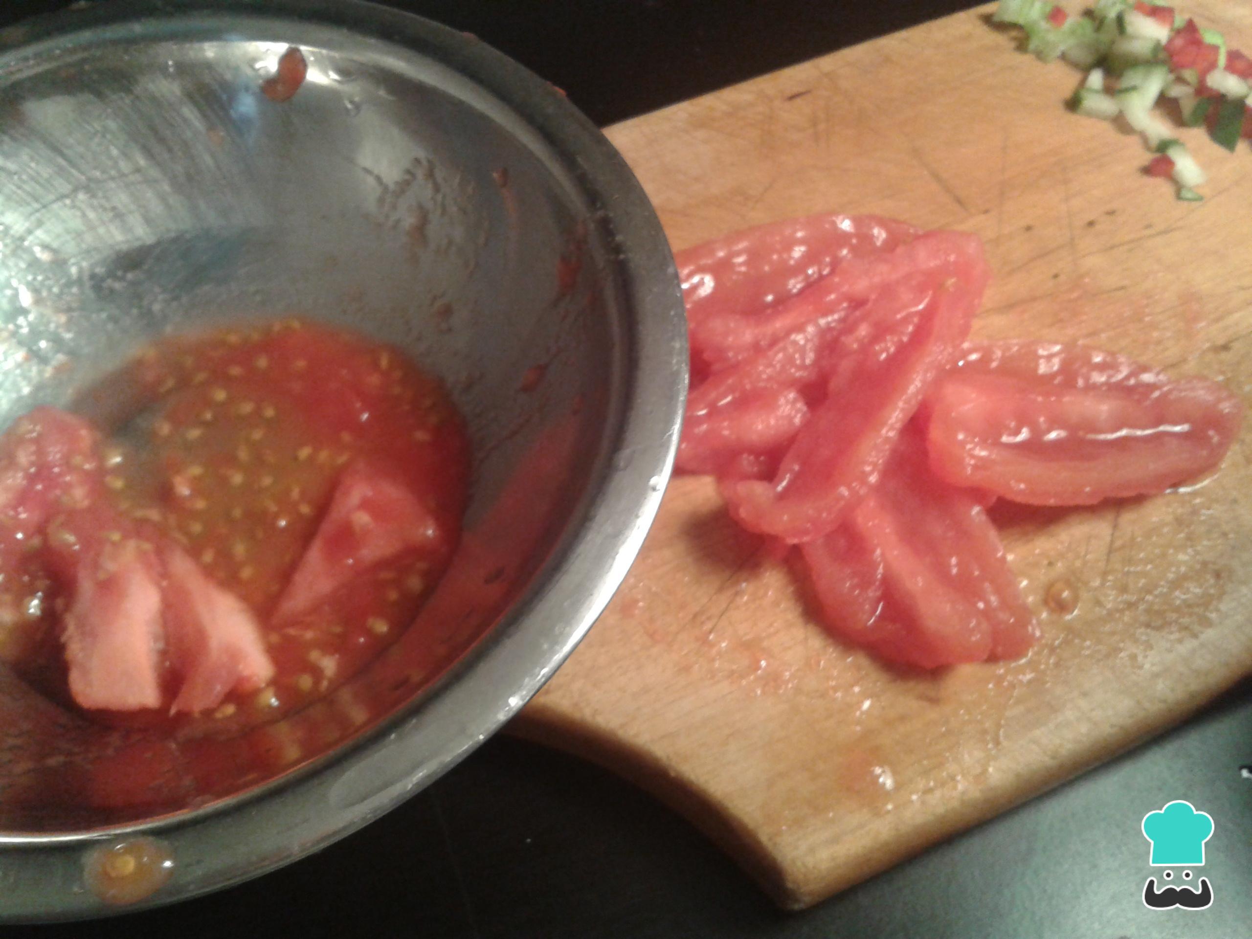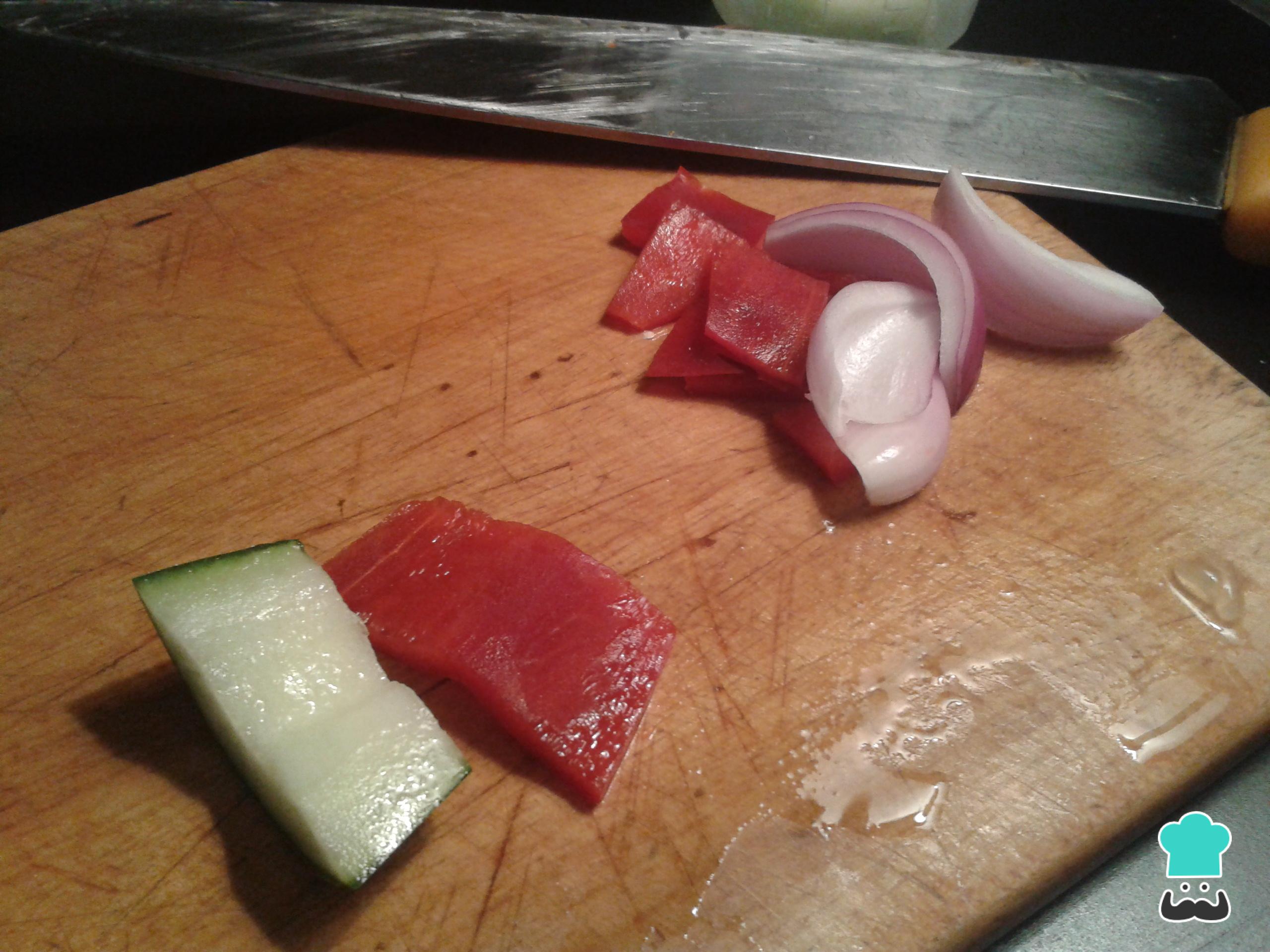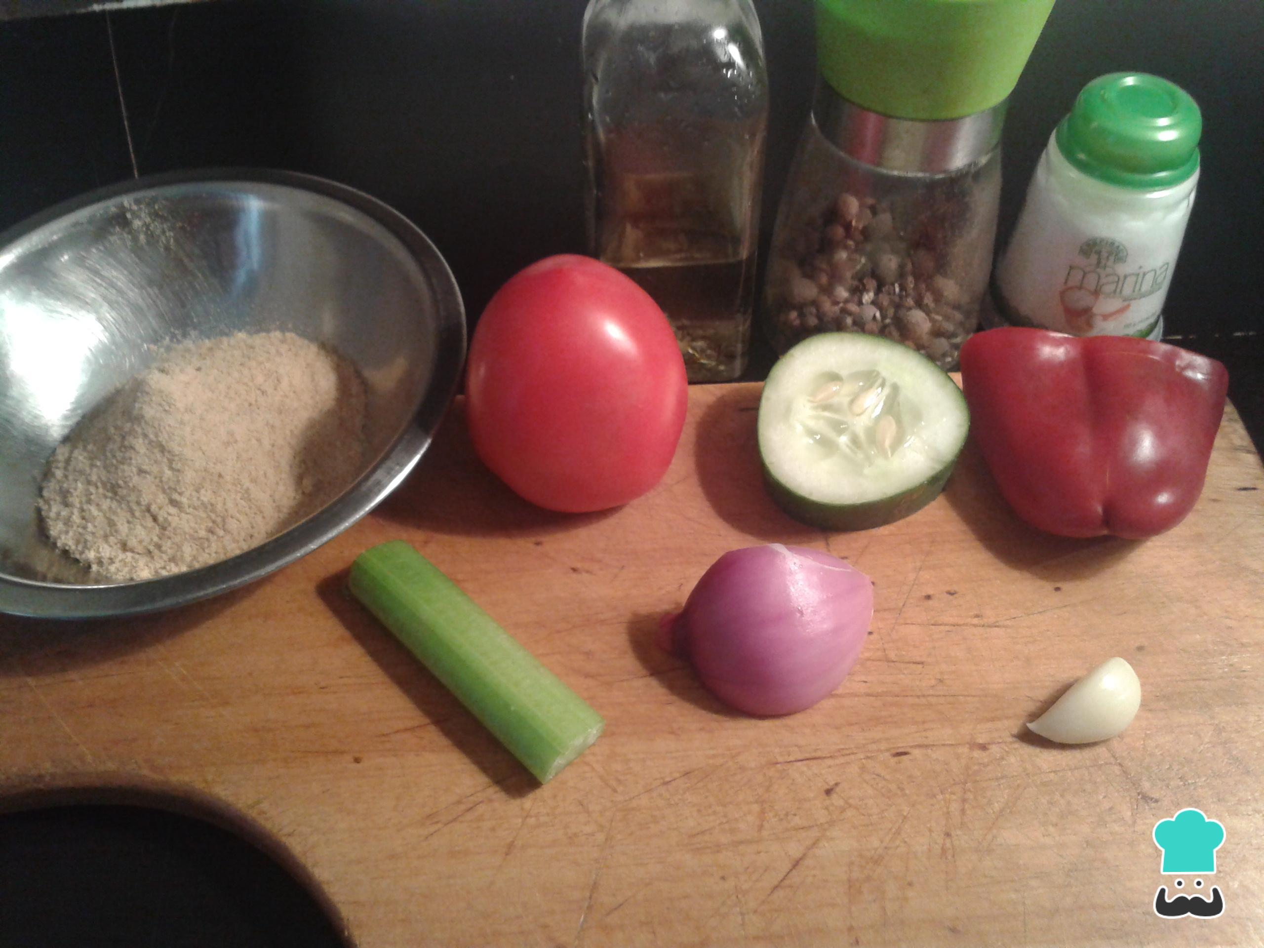 Comece por preparar os ingredientes desta receita de gazpacho andaluz.