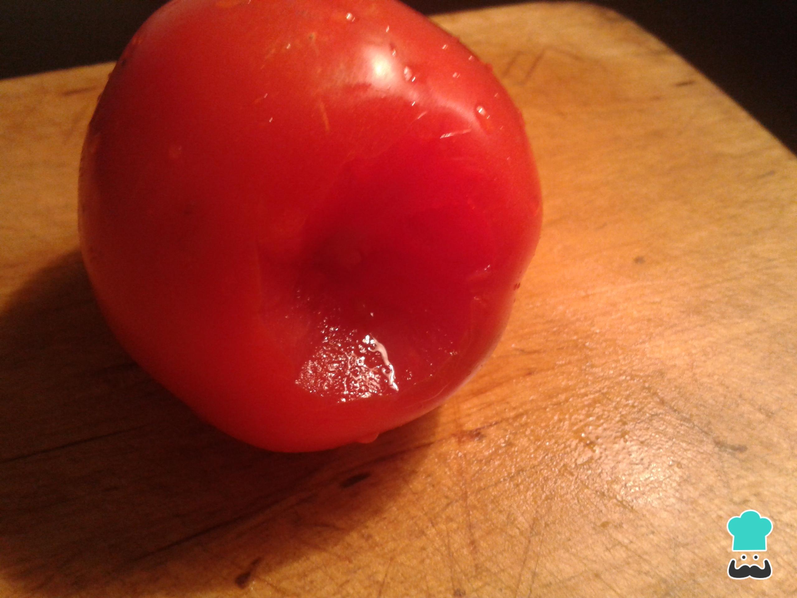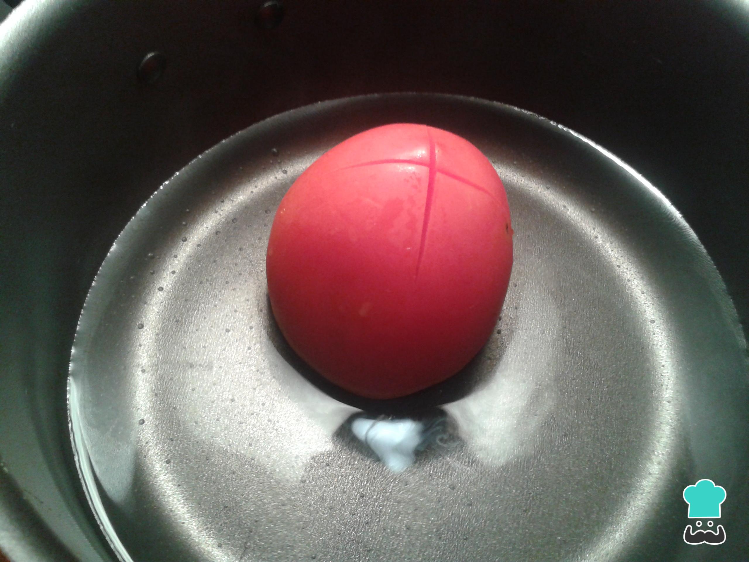 Faça um corte em forma de X na parte de baixo do tomate, para que seja mais fácil retirar a pele, e acrescente à água fervente por 1 minuto.