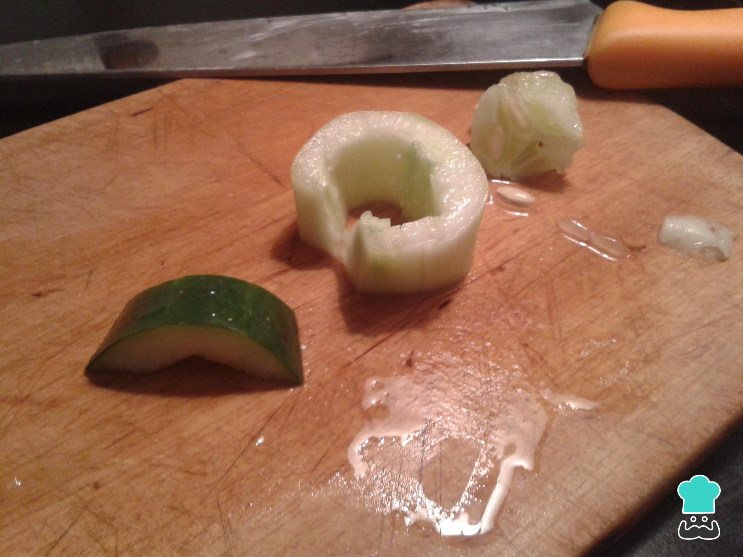 Descasque o pepino e retire as sementes. Se quiser, reserve um pedaço de pepino com casca para usar como decoração desta sopa de verão.