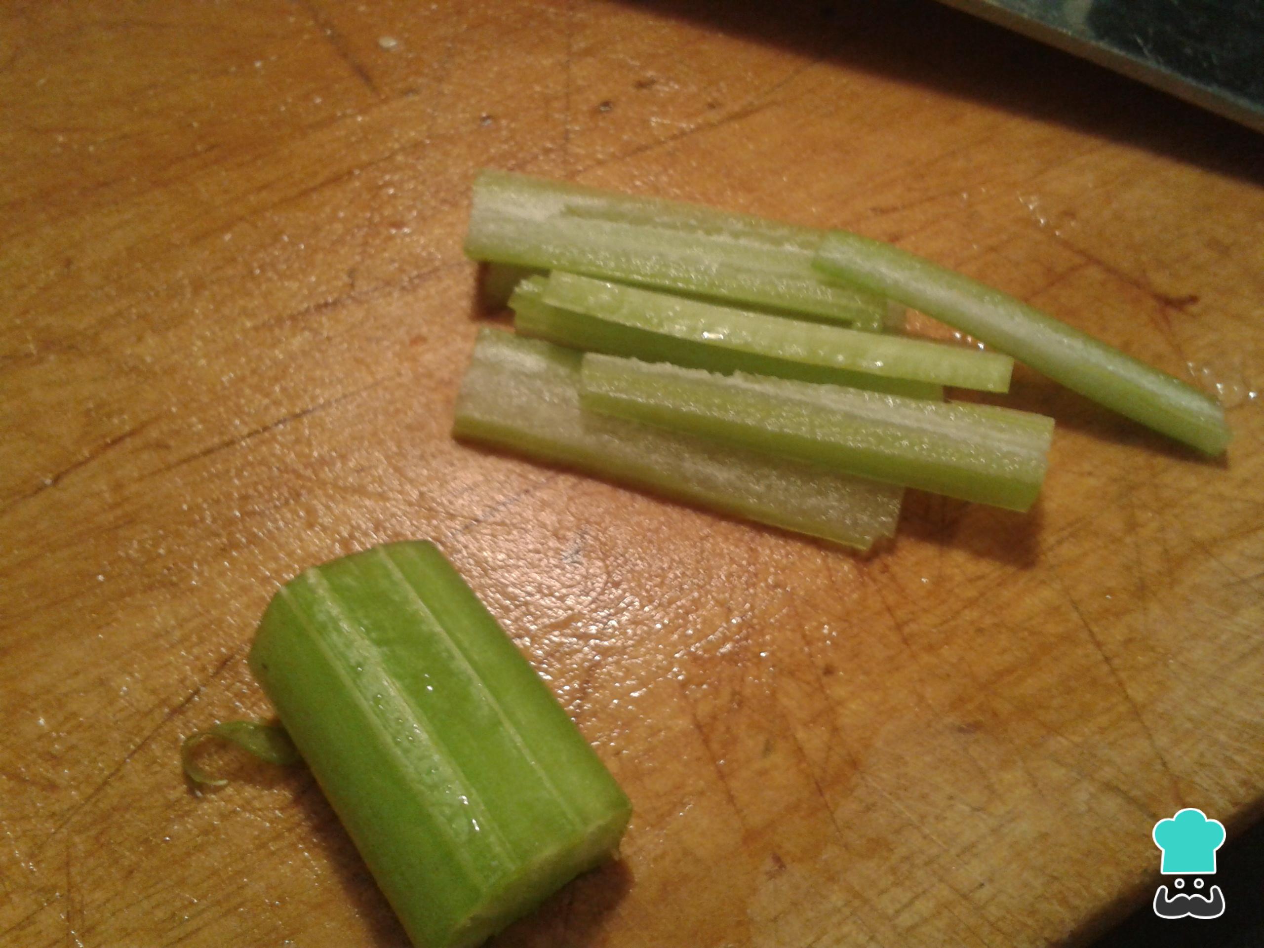 Enquanto isso, corte o aipo em palitos e reserve um pedaço para decoração.