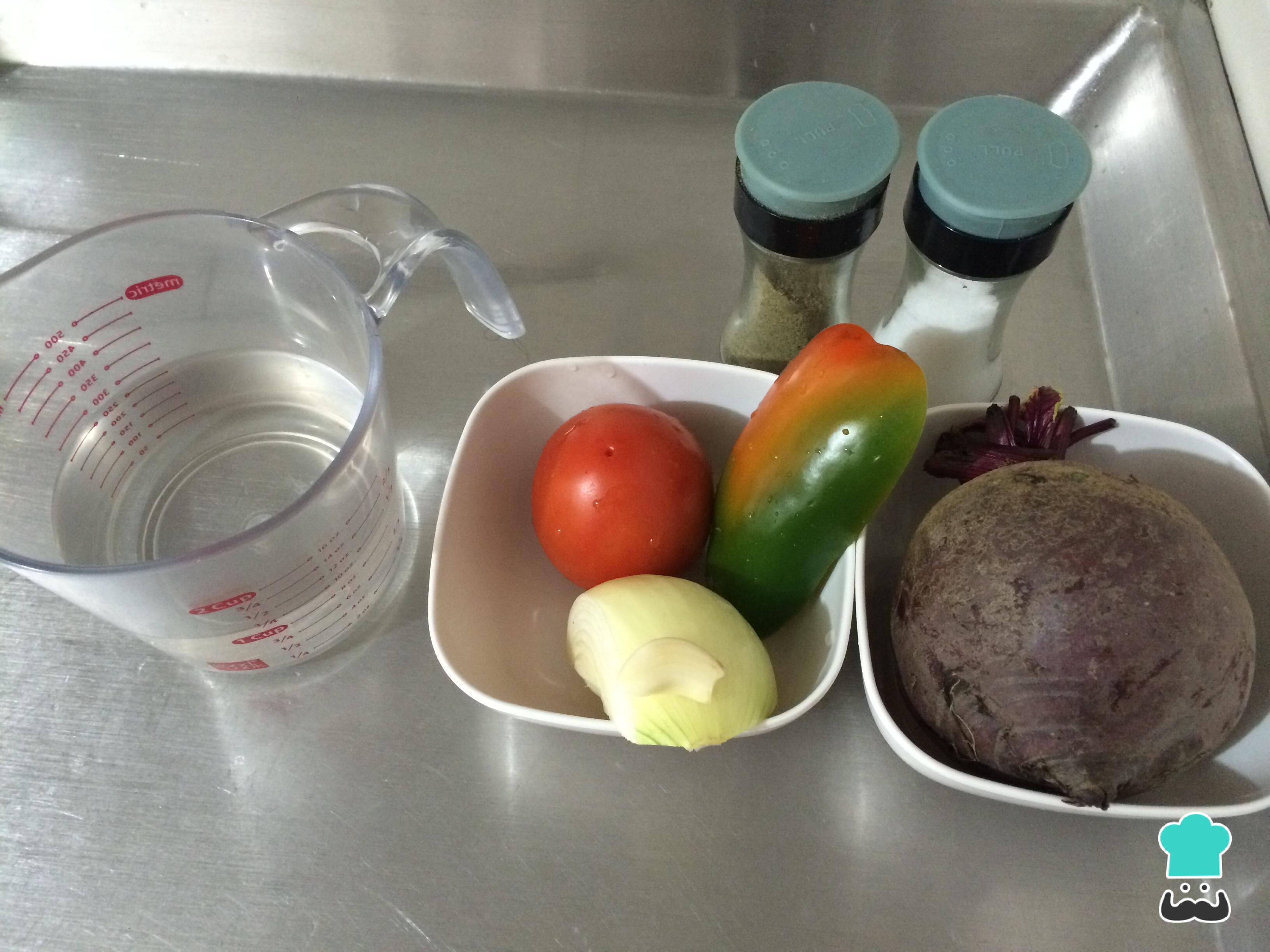 Antes de fazer o gaspacho de beterraba, o primeiro passo é preparar todos os ingredientes.