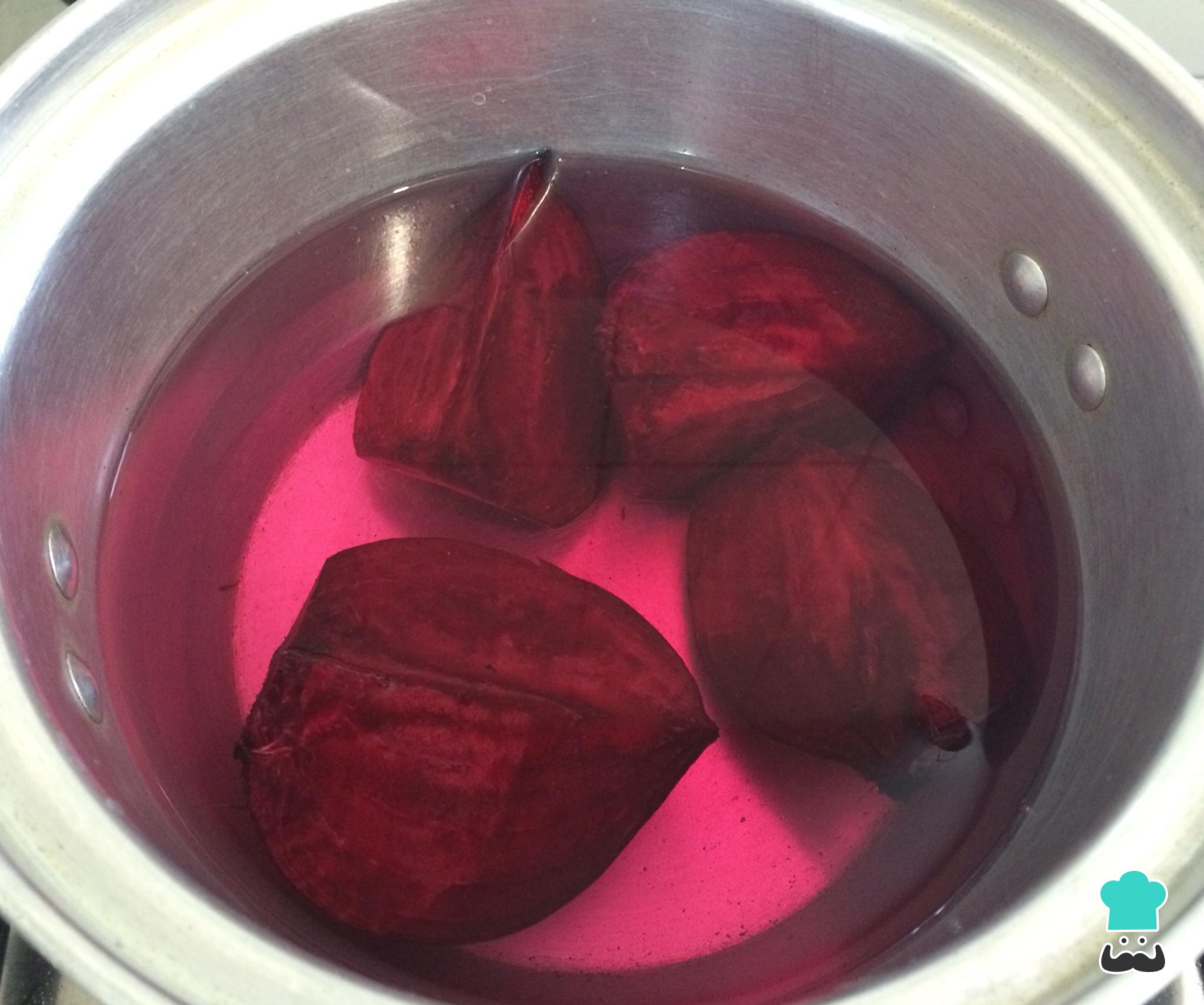 Lave e corte a beterraba em quatro partes, cozinhe com bastante água e uma pitada de sal até ficar macia, cerca de 30 minutos em fogo médio.