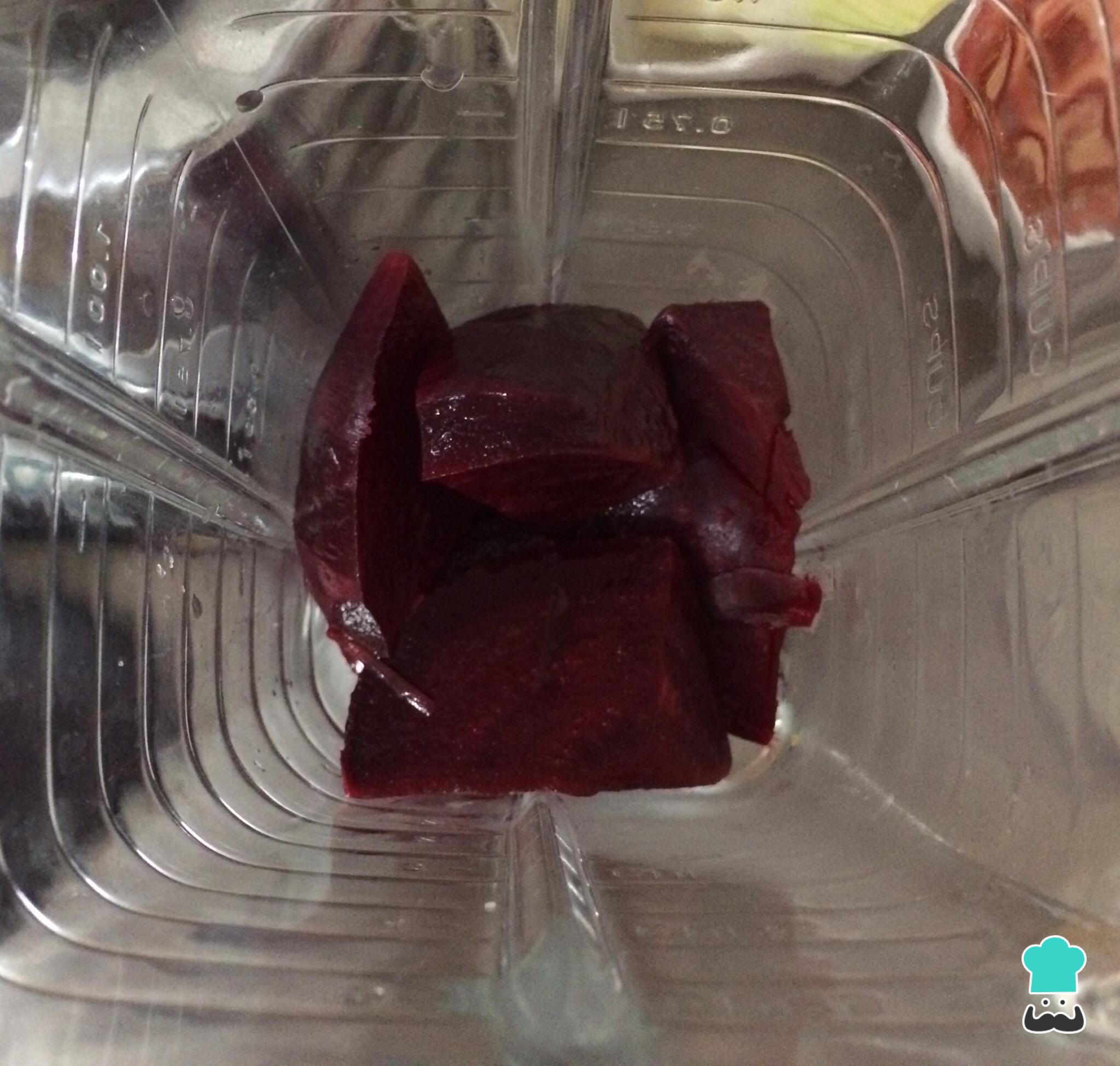 Assim que a beterraba estiver pronta, descasque-a e coloque-a na liquidificadora com um pouco de água. Triture um pouco.