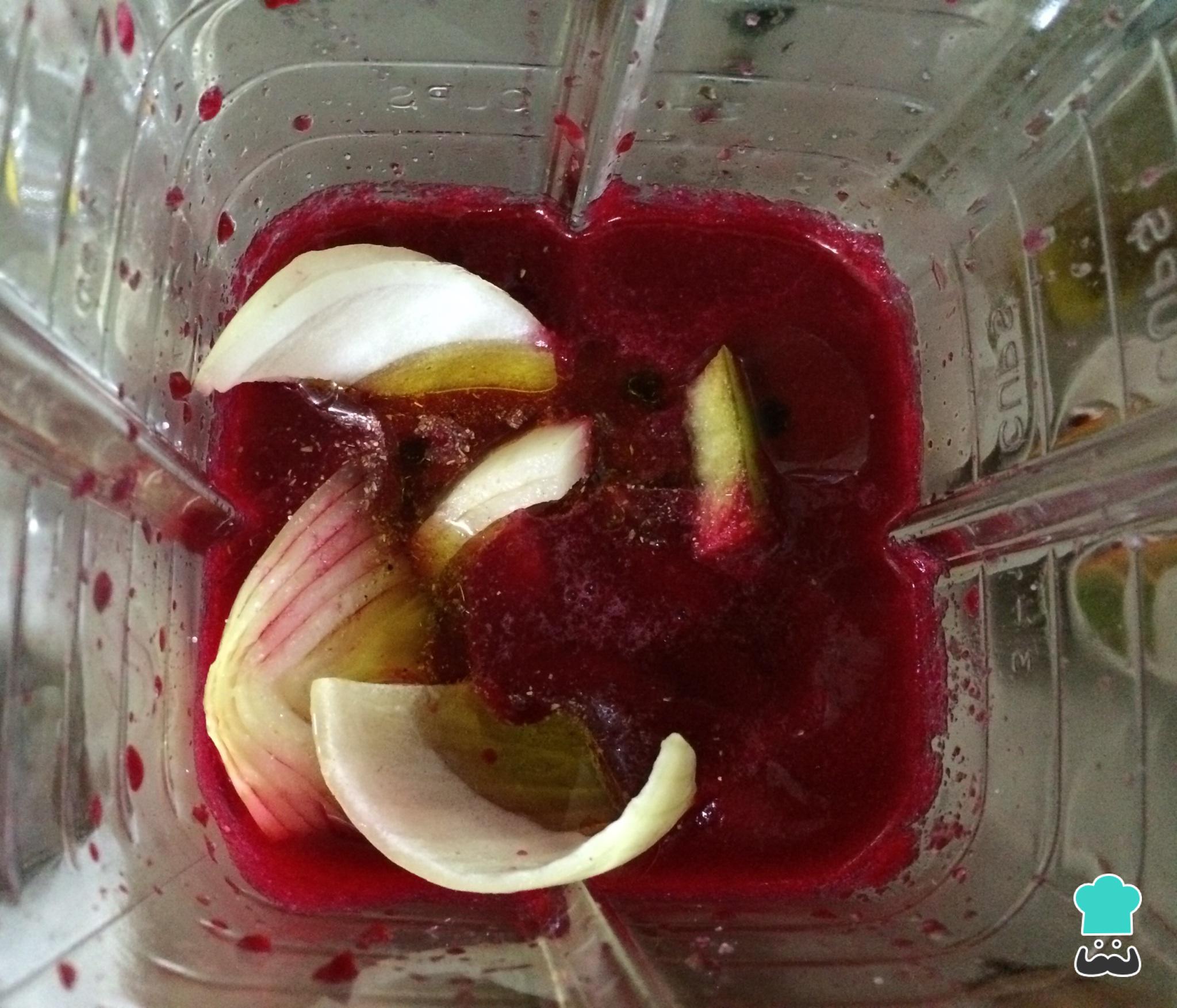 Finalmente adicione a cebola, o alho, o pimentão verde e uma colher de sopa de azeite, se for necessário adicione água para diluir o gaspacho de beterraba. Deverá obter uma mistura suave. Retifique o sabor com sal e pimenta do reino.