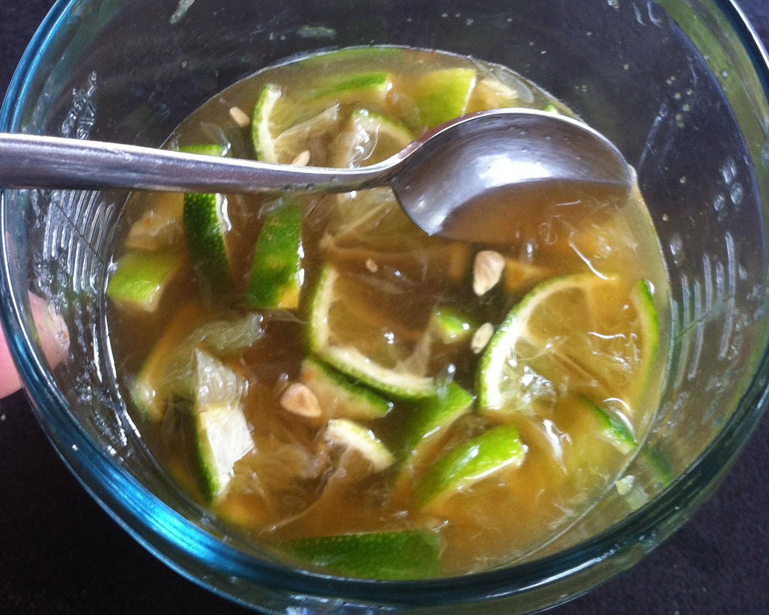 Pique os limões em pedaços e coloque numa coqueteleira ou pilão junto com o açúcar. Amasse bem com um socador.