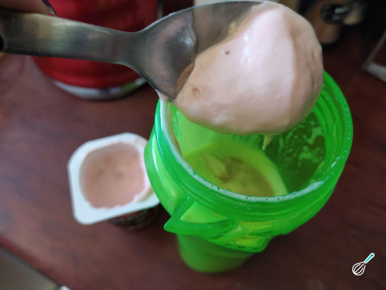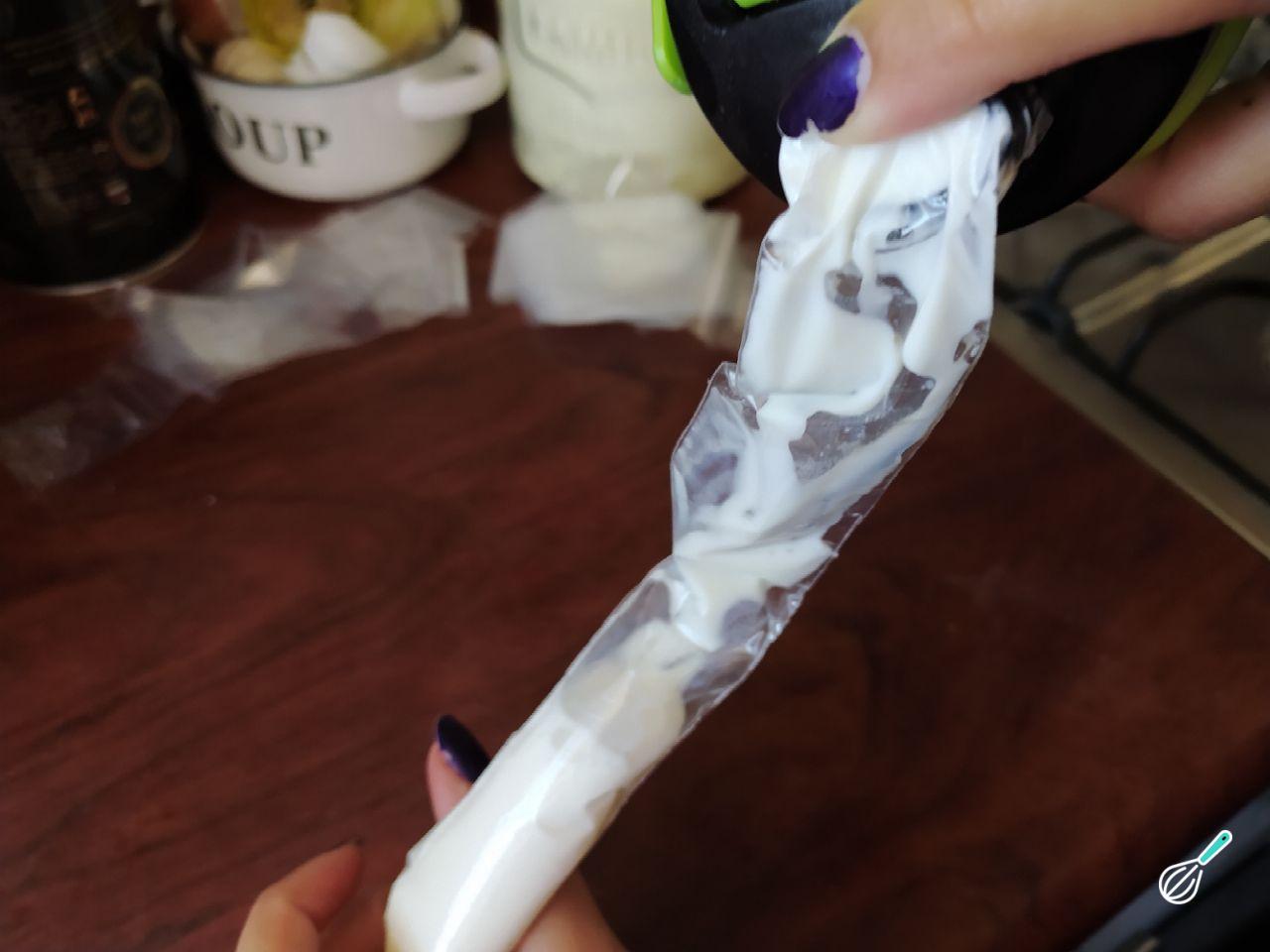 Depois de bater bem, basta colocar a mistura de geladinho de iogurte nos saquinhos de geladinho. Você pode fazer isso mais facilmente com a ajuda de um funil ou de uma garrafa pet.