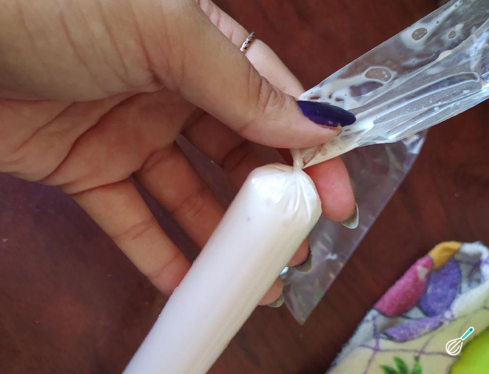 Encha o saquinho de geladinho deixando um espaço livre no final, para poder amarrar. Para isso, enrole a extremidade vazia do geladinho, exercendo pressão para eliminar bolhas de ar no interior.