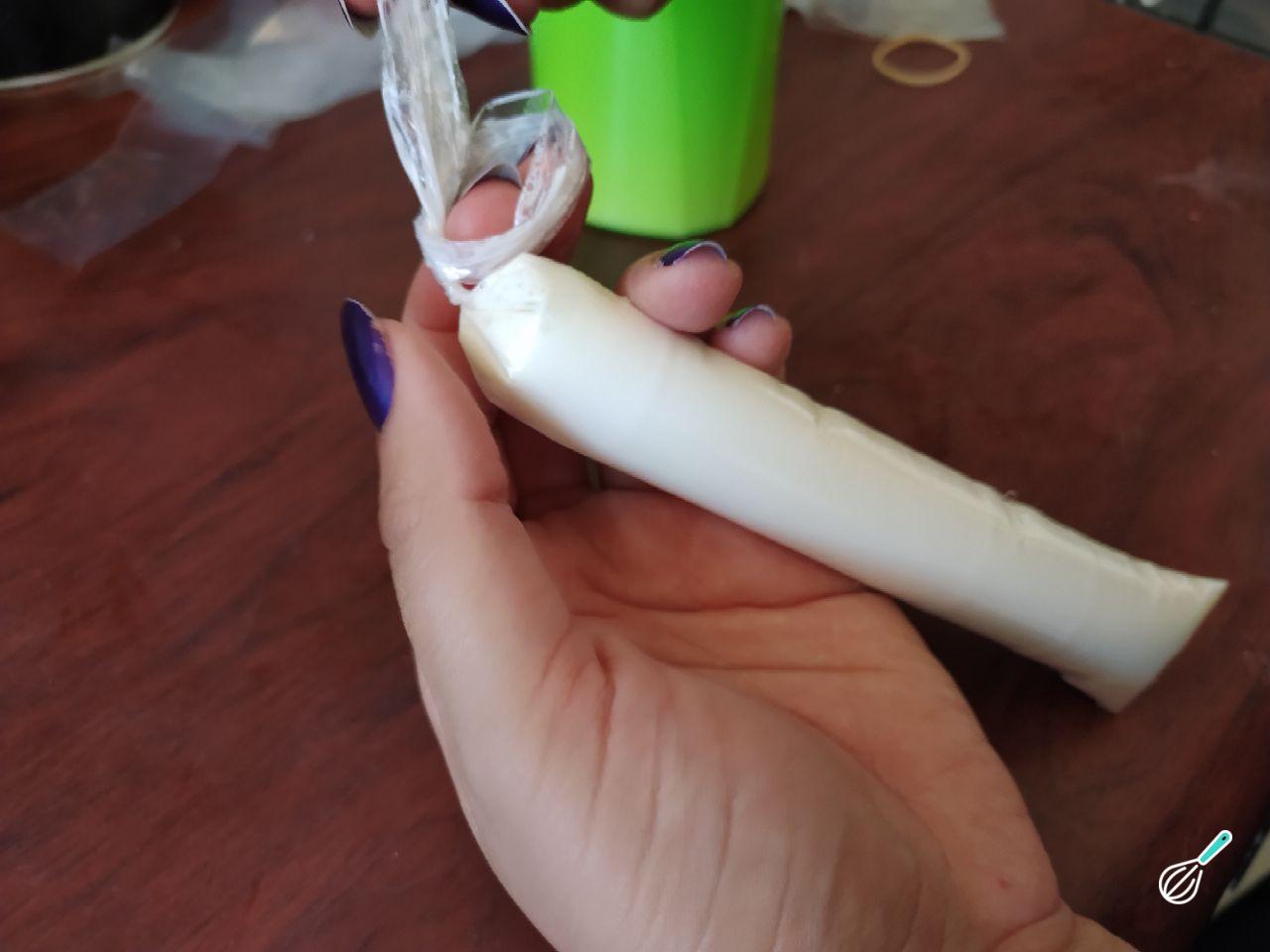 Depois basta amarrar um nó, de modo a fechar bem. Lembre que, neste passo, é muito importante não soltar o saquinho, que a mistura de geladinho vaze e para que mantenha o seu formato compacto no interior.