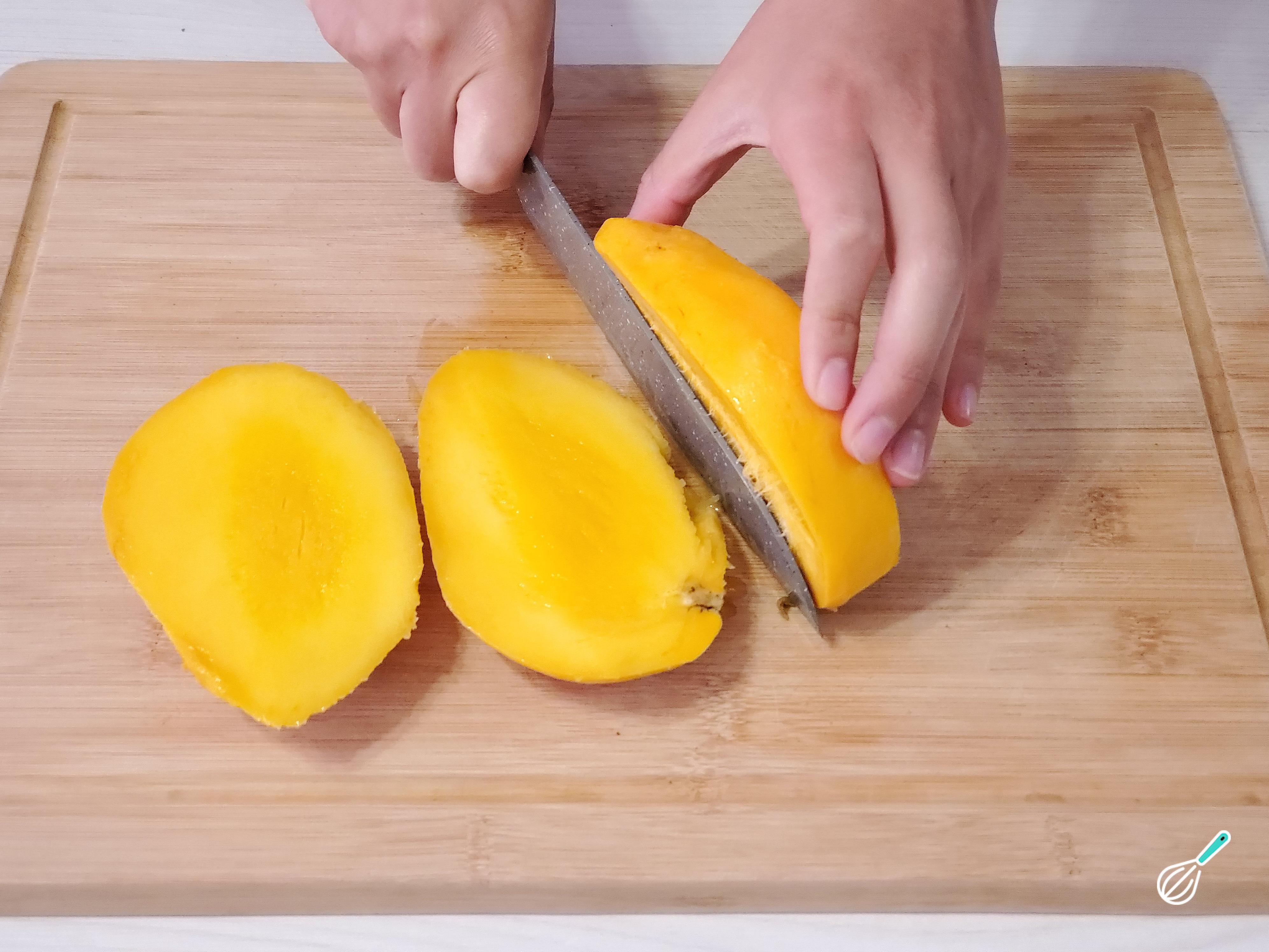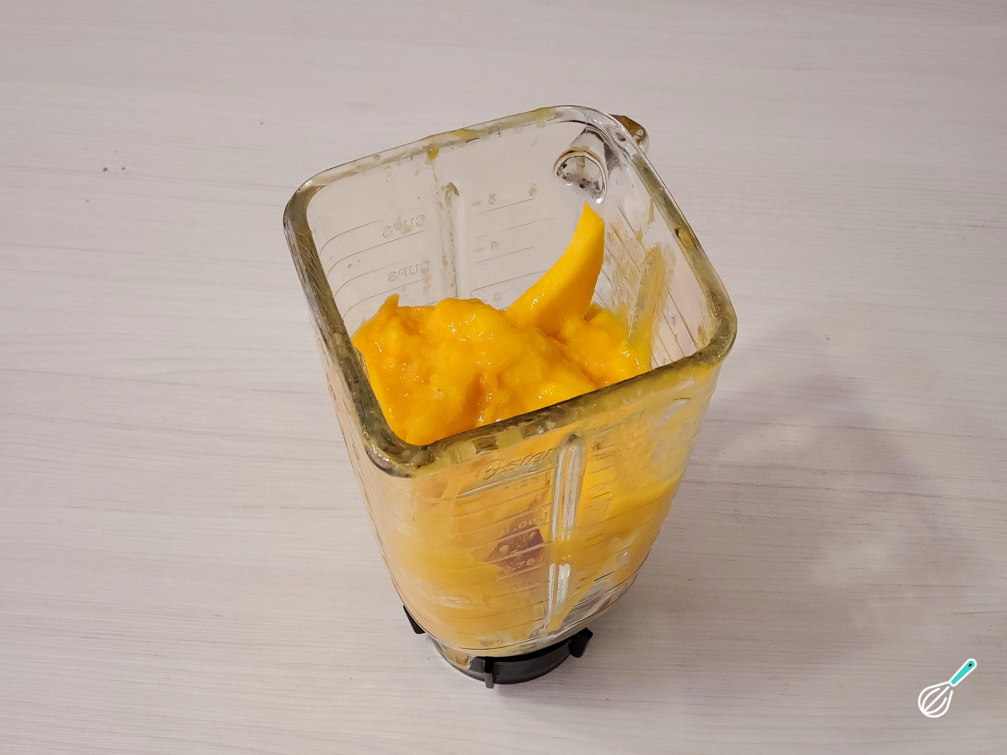 Comece lavando e descascando as mangas. Em seguida, coloque-as em uma tábua e corte as extremidades bem na borda da semente. Em seguida, retire a polpa que restou, passando a ponta da faca ao redor da semente. Coloque toda essa polpa no copo do liquidificador.