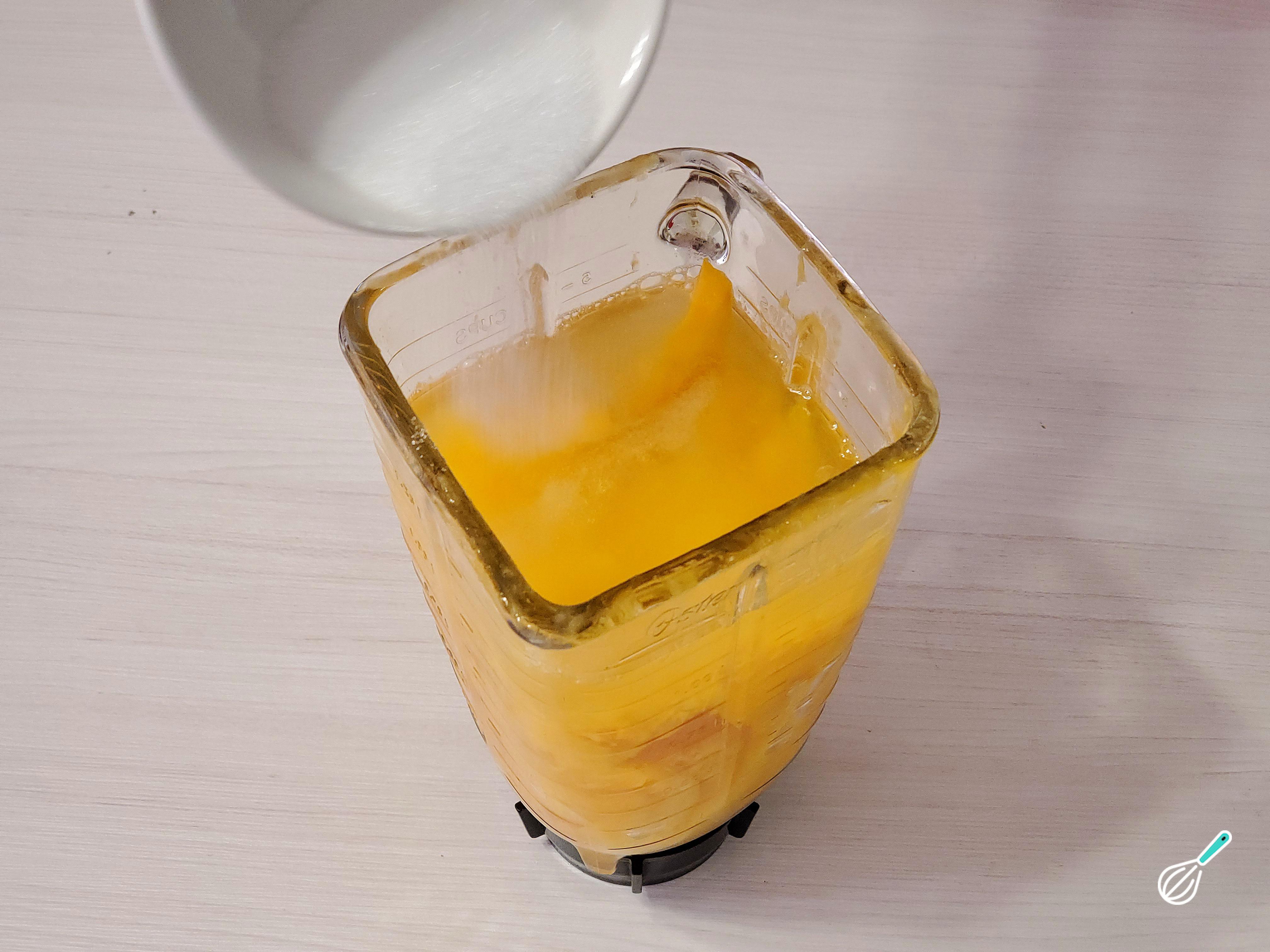 Despeje um litro e meio de água gelada ou a quantidade máxima recomendada pelo liquidificador. Se você gosta de milkshakes de manga, pode substituir metade da quantidade de água por leite, mas se não gostar do sabor ou não puder consumir laticínios, pode usar leites vegetais, como o leite de amêndoas.