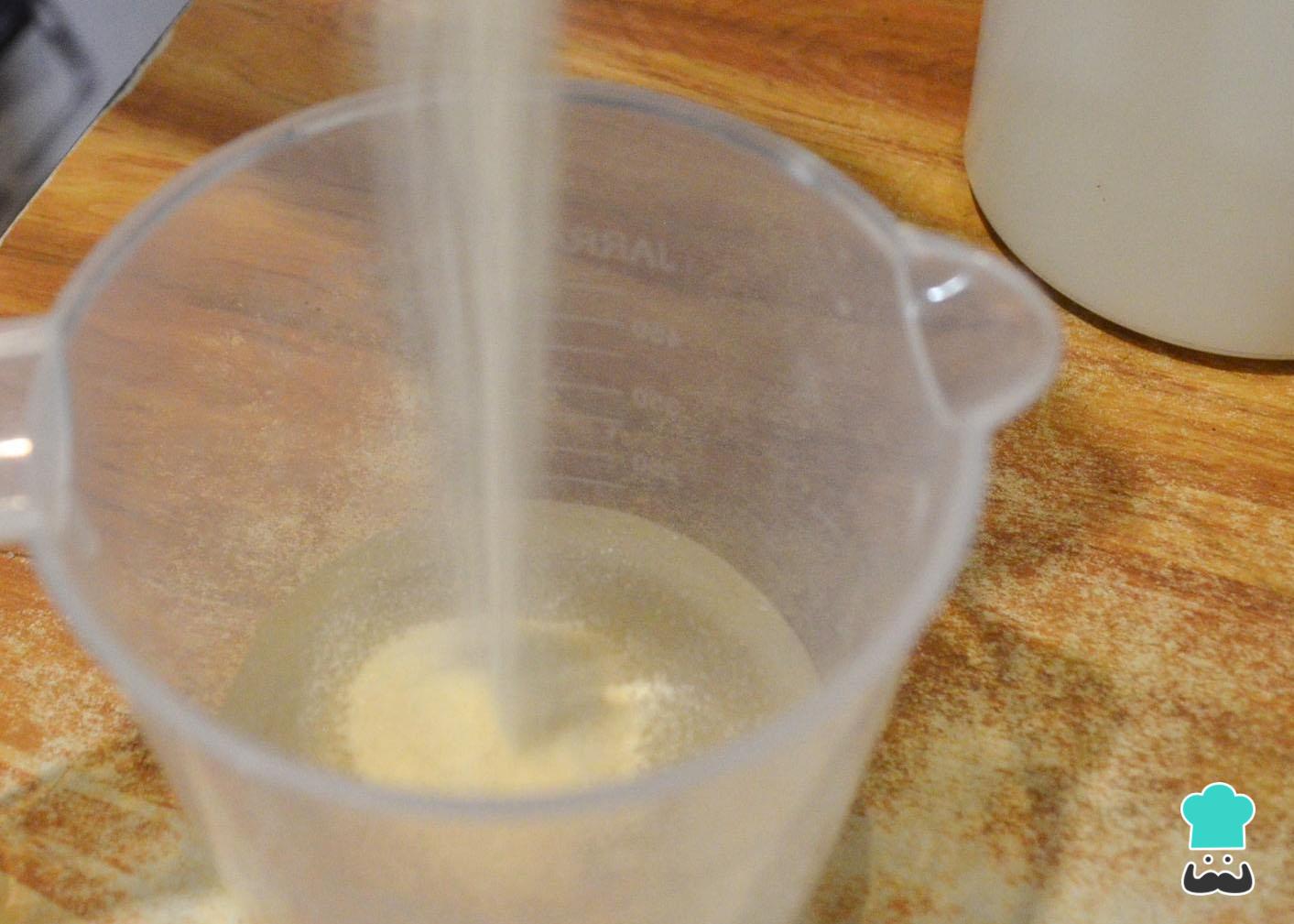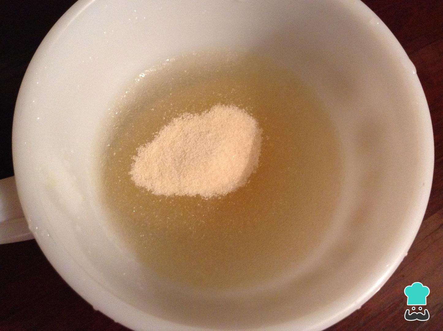 Para fazer a camada branca deste mosaico de gelatina hidrate a restante gelatina sem sabor em meia xícara de água. Quando estiver durinha acrescente 1 xícara de água quente e a lata de leite condensado e misture até dissolver a gelatina por completo.