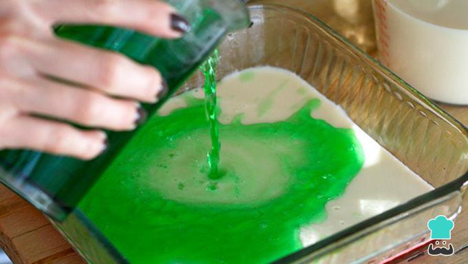 Finalmente monte a gelatina de Natal numa assadeira untada: coloque metade da gelatina de morango e reserve na geladeira por 30 minutos. Retire, acrescente 1/3 da gelatina com leite condensado e leve à geladeira por mais 30 minutos. Retire, adicione metade da gelatina de limão e reserve na geladeira por mais 30 minutos.