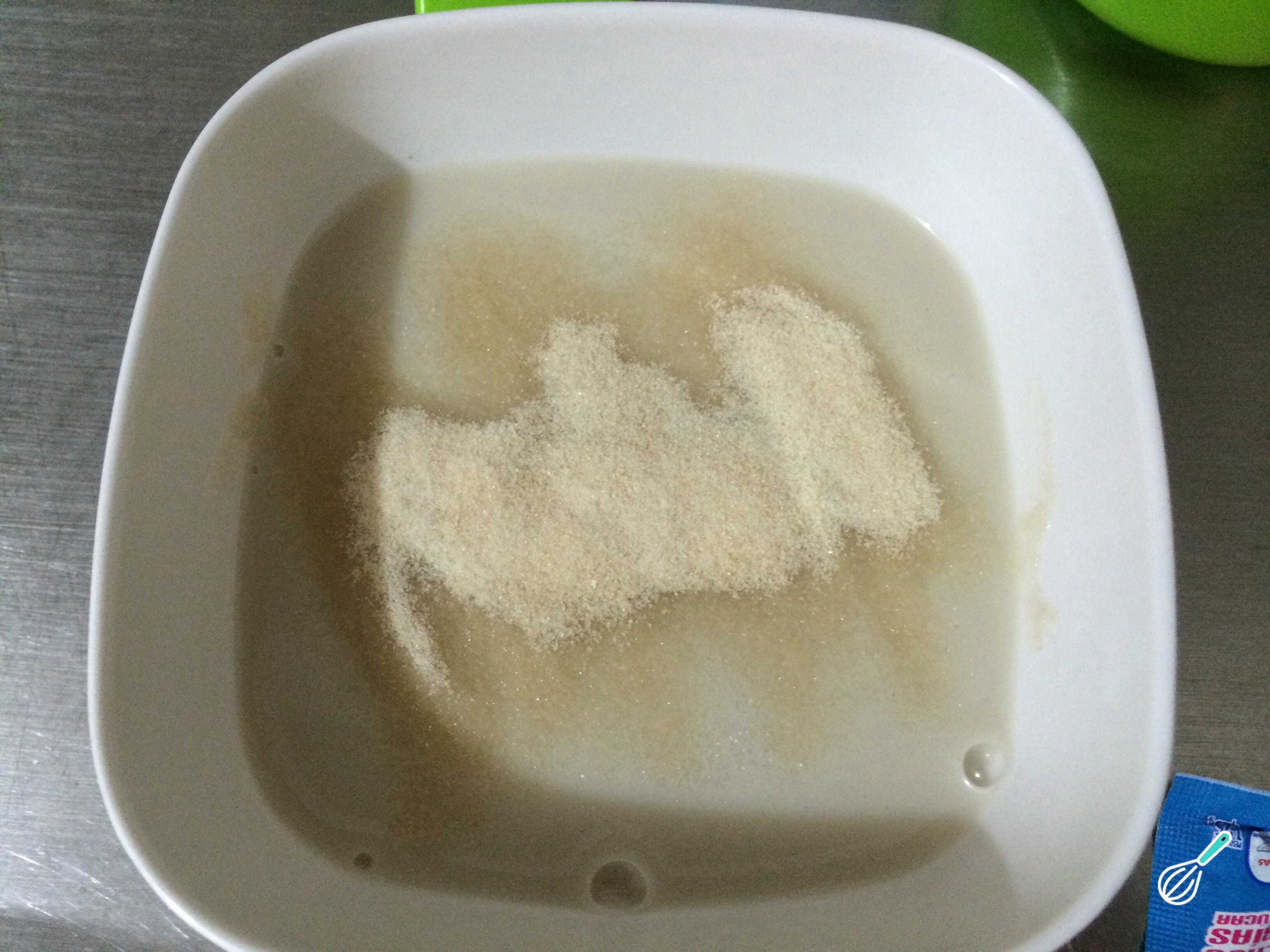 Em uma tigela misture o leite de amêndoas com o adoçante e a gelatina sem sabor, para dissolver.