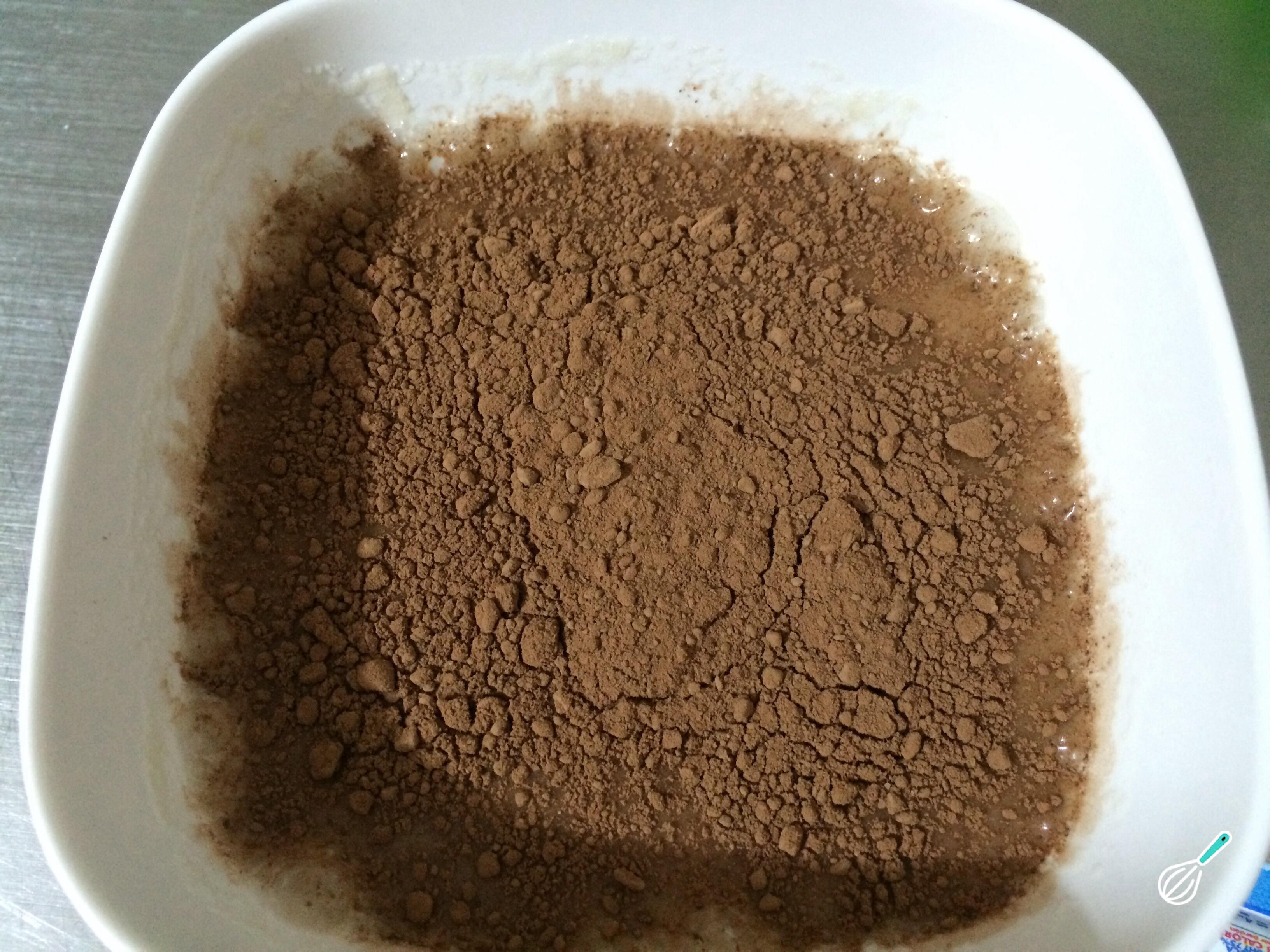 Adicione o cacau em pó, que é o principal ingrediente desta gelatina de chocolate light, e misture muito bem.