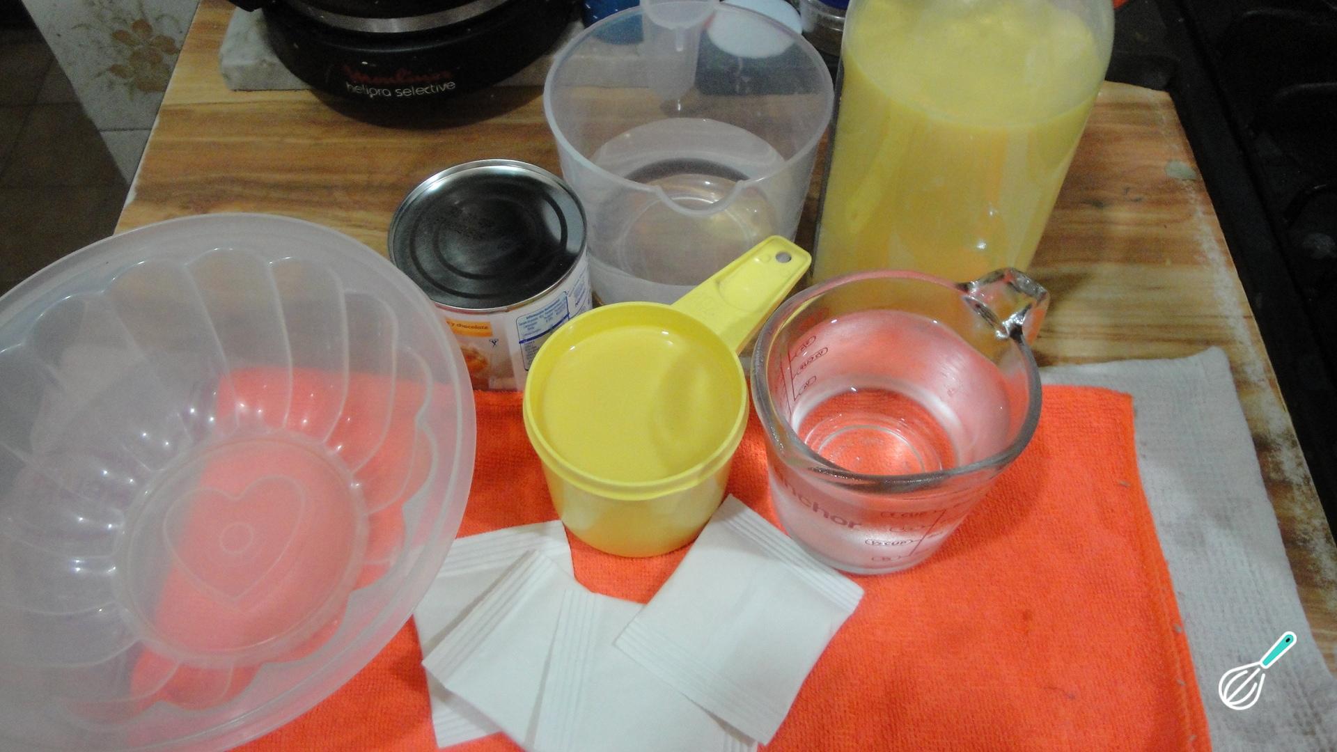 Para preparar a gelatina de rompope, reúna todos os ingredientes. Comece por colocar um copo de água na geladeira por 10 minutos. Pode usar forminhas individuais ou uma fôrma grande.