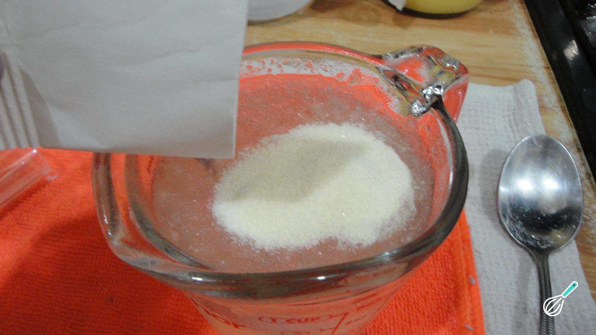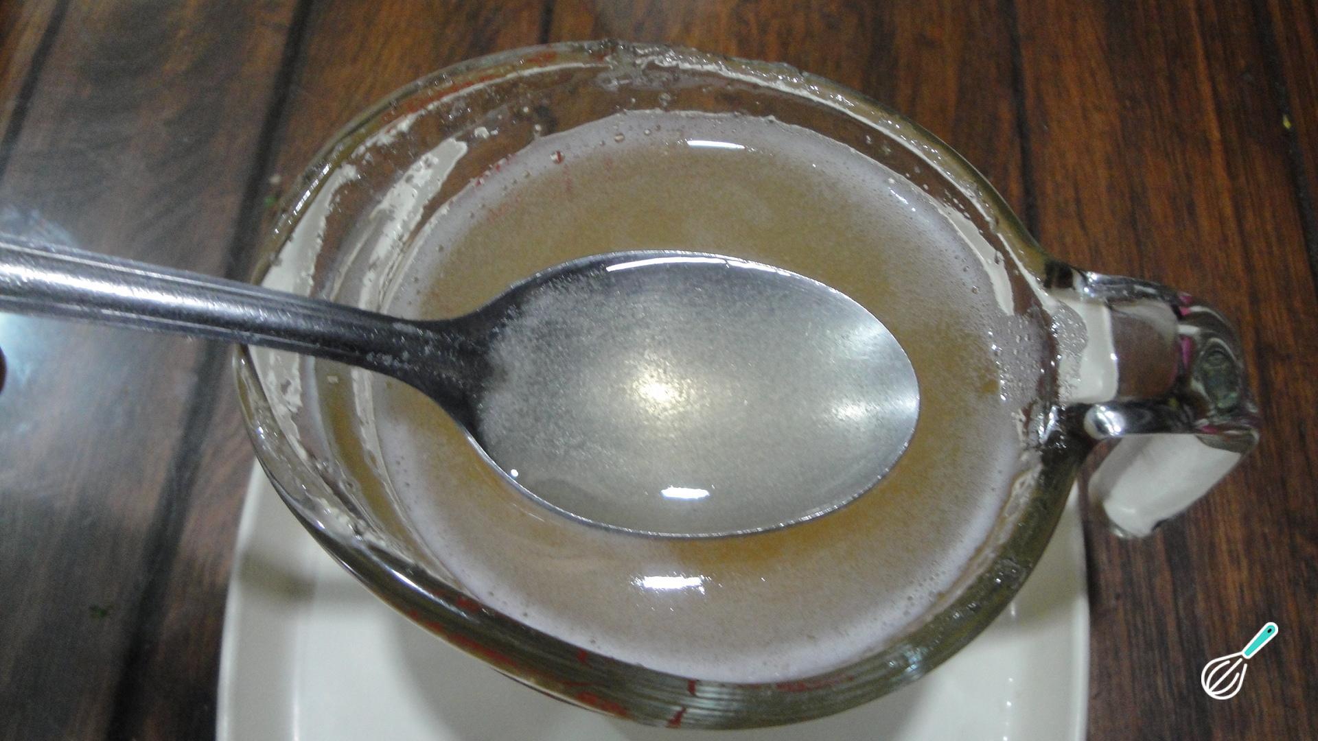 Retire a gelatina sem sabor da geladeira, leve ao microondas por 20 segundos, bata e volte a colocá-la por mais 20 segundos até que esteja líquida.