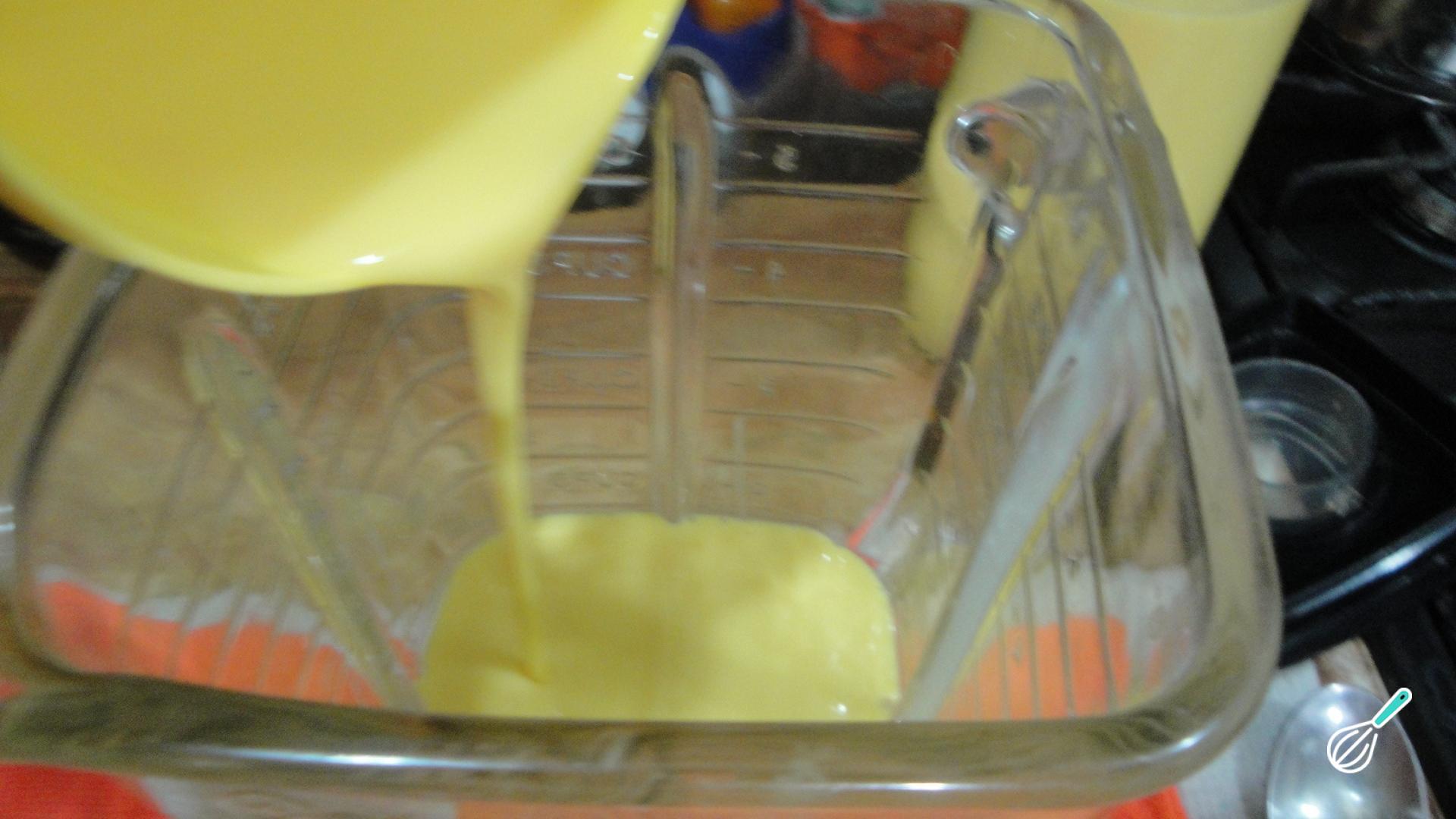 Despeje a gelatina no copo do liquidificador com o resto dos ingredientes e bata por 3 minutos. Despeje na forma previamente untada com manteiga.