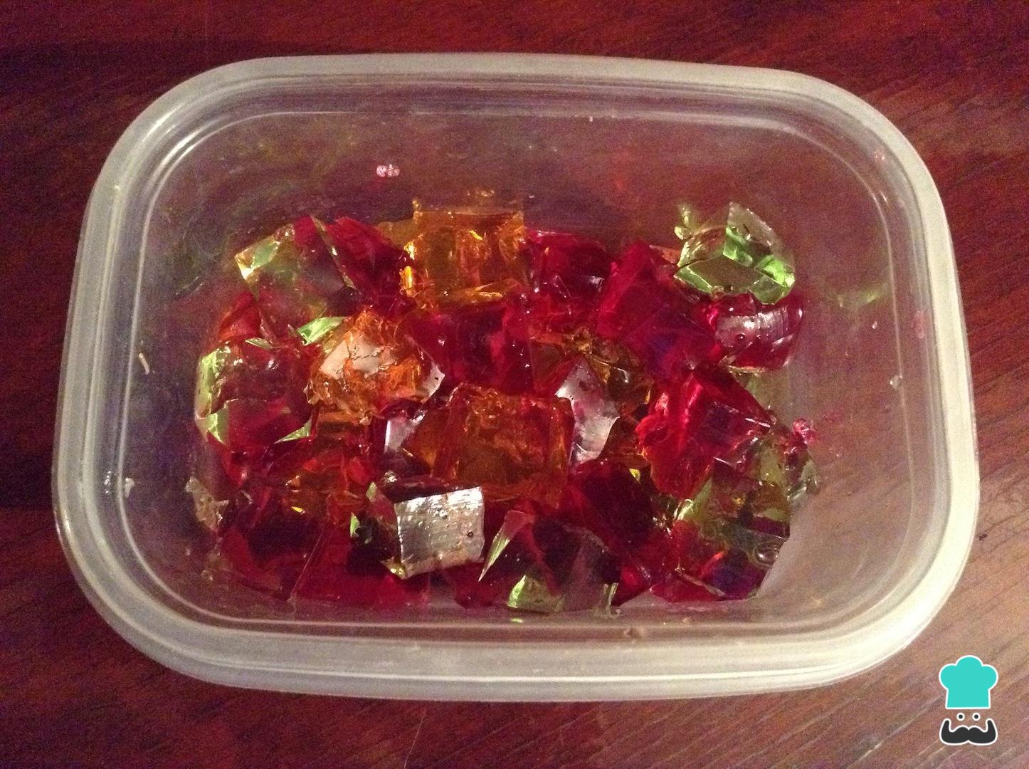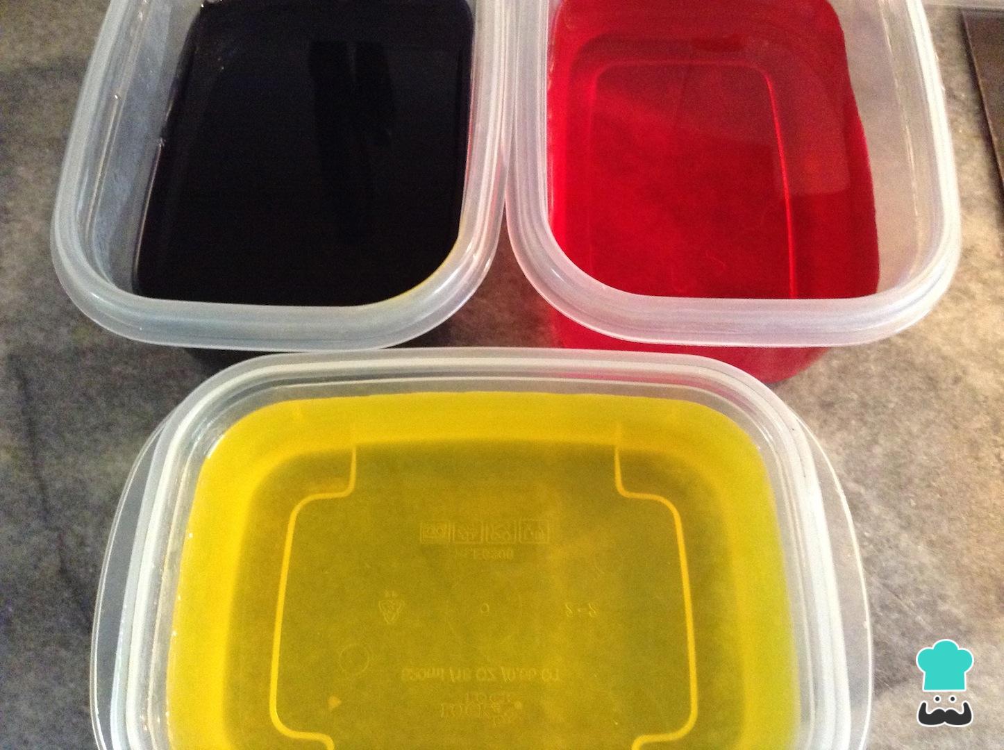 Para fazer esta sobremesa colorida comece por preparar as diferentes gelatinas do jeito tradicional (com exceção da gelatina sem sabor), cada uma em um recipiente separado. Depois reserve na geladeira por 2-3 horas, até que estejam firmes.