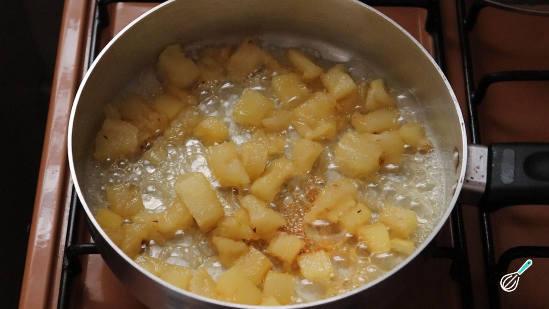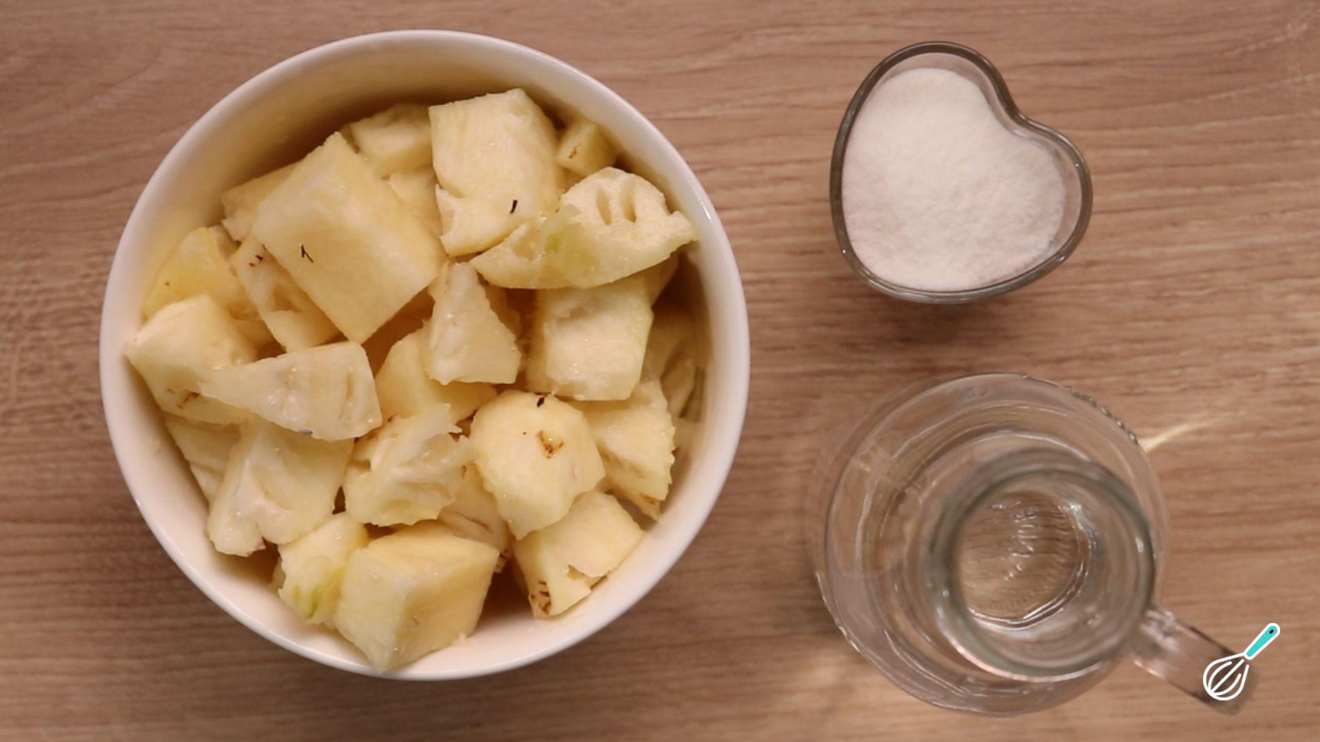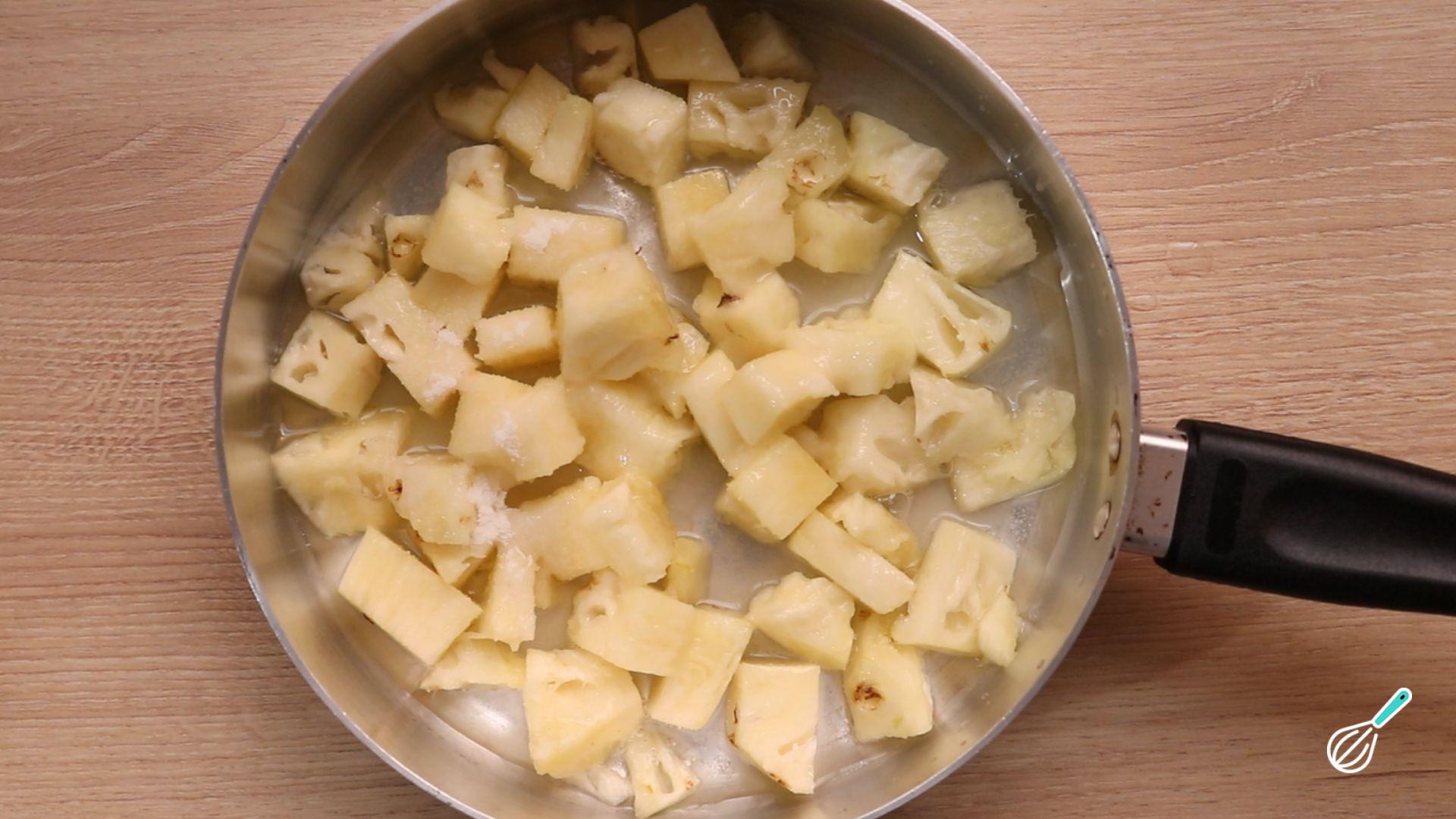 Em uma panela coloque o abacaxi picado, açúcar, água e o suco de limão. Cozinhe em fogo baixo por 15 minutos mexendo de vez em quando.