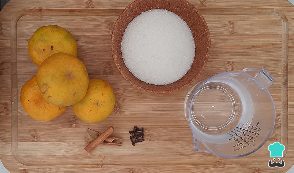 Separe os ingredientes necessários para preparar a geleia de bergamota caseira. As bergamotas precisam estar maduras para garantir o sabor acentuado e adocicado próprio da fruta.