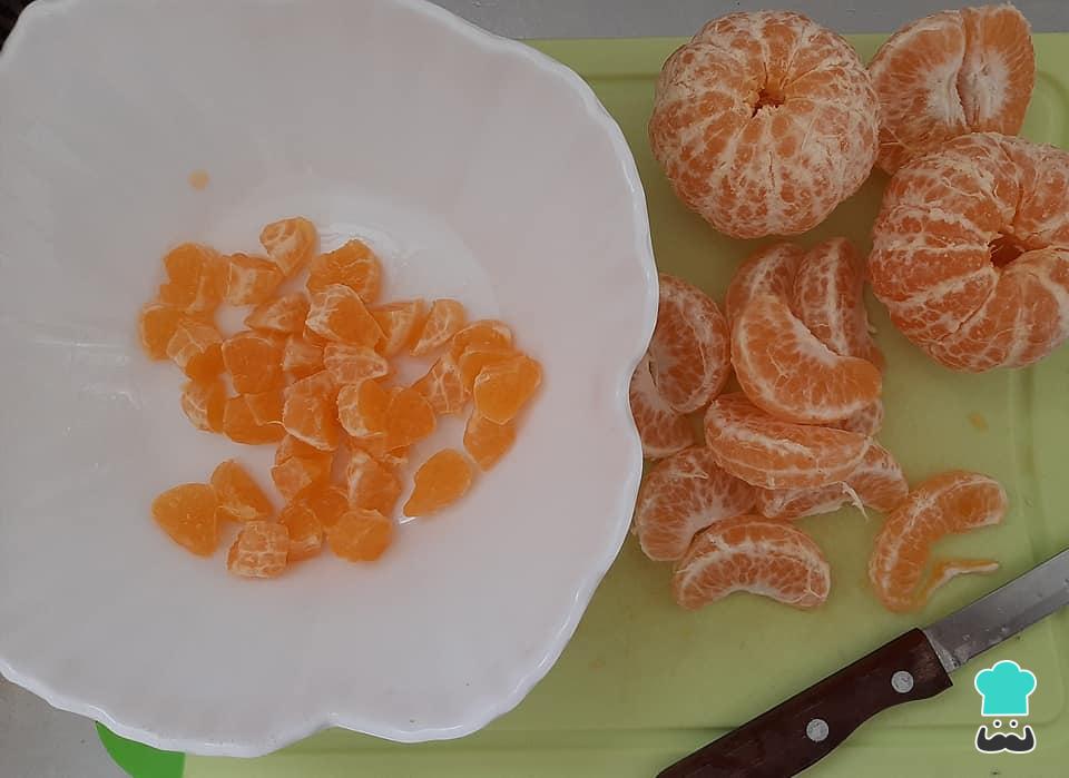 Limpe todos os gomos, retirando as partes brancas e as sementes - esse é um dos truques importantes de como tirar o amargo da geleia de bergamota. Corte os gomos em 3 ou 4 partes e reserve.