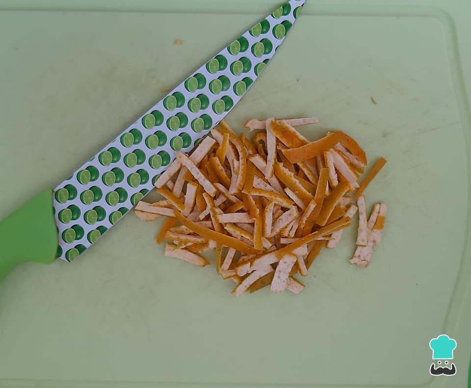 Dica: antes de cortar as cascas em tirinhas, retire todos os filamentos brancos.
