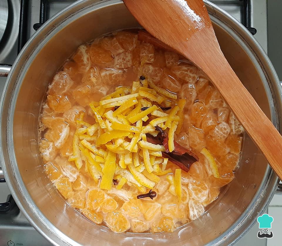 Numa panela média junte os gomos picados, as cascas da fruta já aferventadas e escorridas, os cravos da Índia, a canela em pau e o açúcar. Deixe cozinhando em fogo alto e, quando começar a fervura, diminua o fogo e deixe cozinhando por cerca de 35-40 minutos, mexendo de vez em quando para não grudar no fundo da panela.