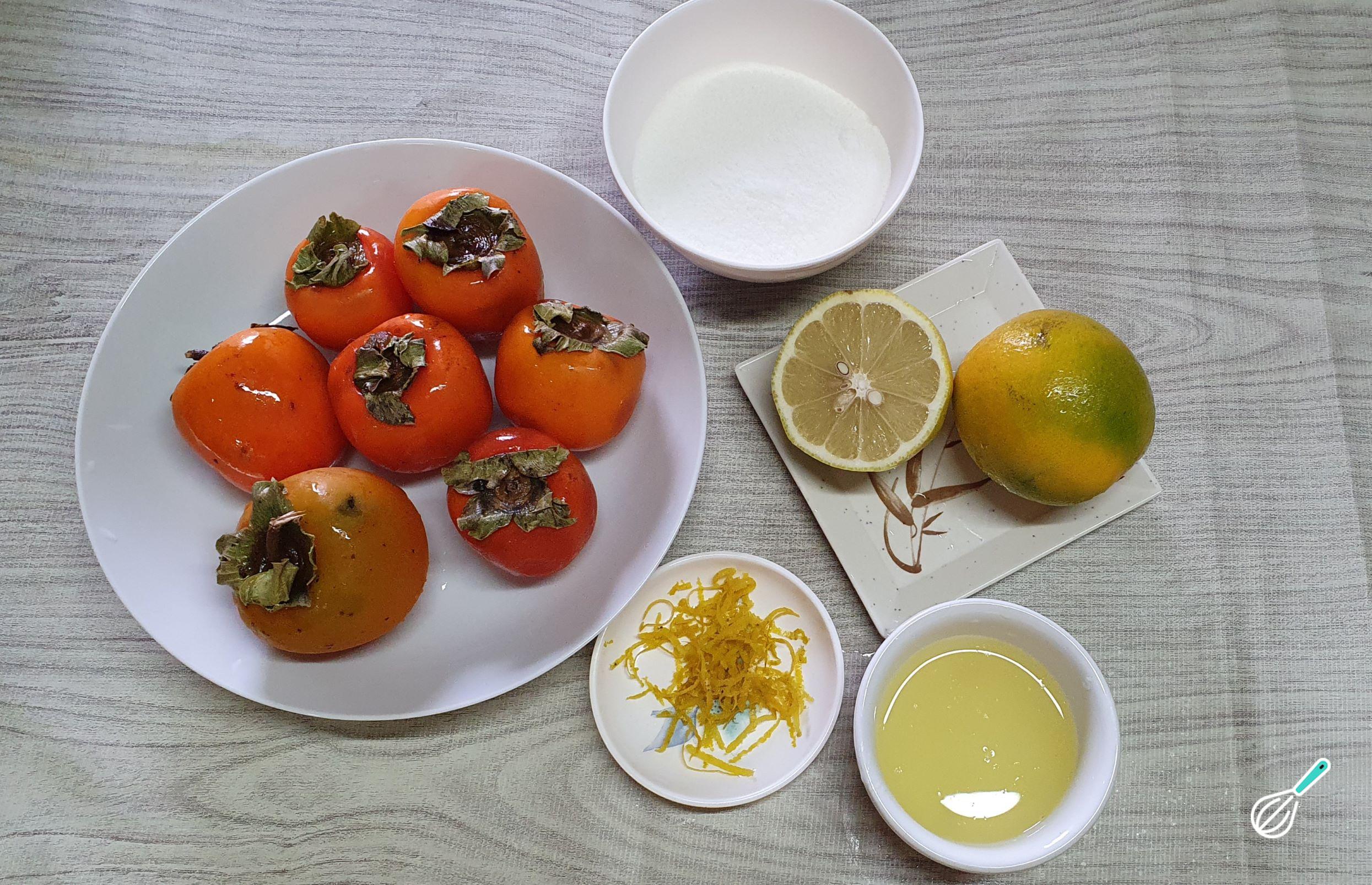Separe os ingredientes da receita: os caquis previamente higienizados, suco de meio limão, as raspas de uma laranja e o açúcar.