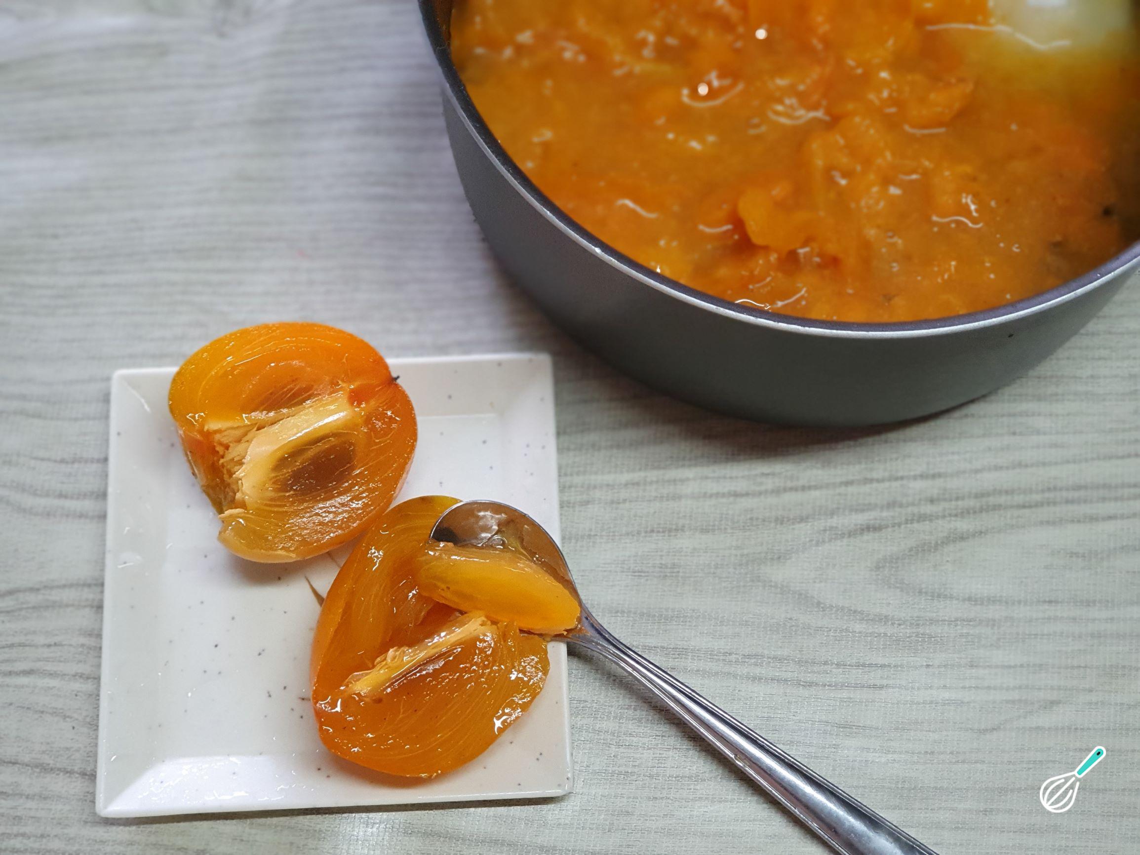 Dica: ao escolher o caqui, que seja bem maduro, sugiro que experimente um pouco de cada um para ter a certeza de que eles estão doces o suficiente e que não estejam com a famosa 'trava', caso contrário este tipo de caqui com a trava irá estragar todo o seu doce.