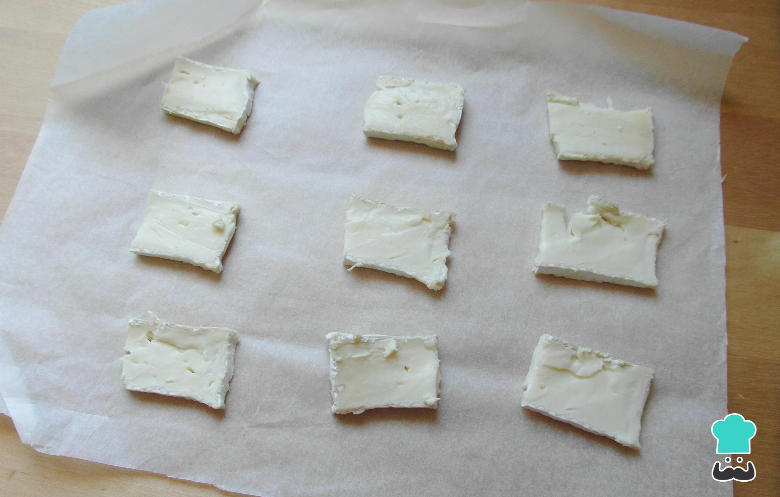 Comece por cortar o queijo brie em fatias e colocar sobre papel manteiga. Leve ao forno preaquecido a 200ºC por 5 minutos, apenas para derreter ligeiramente.