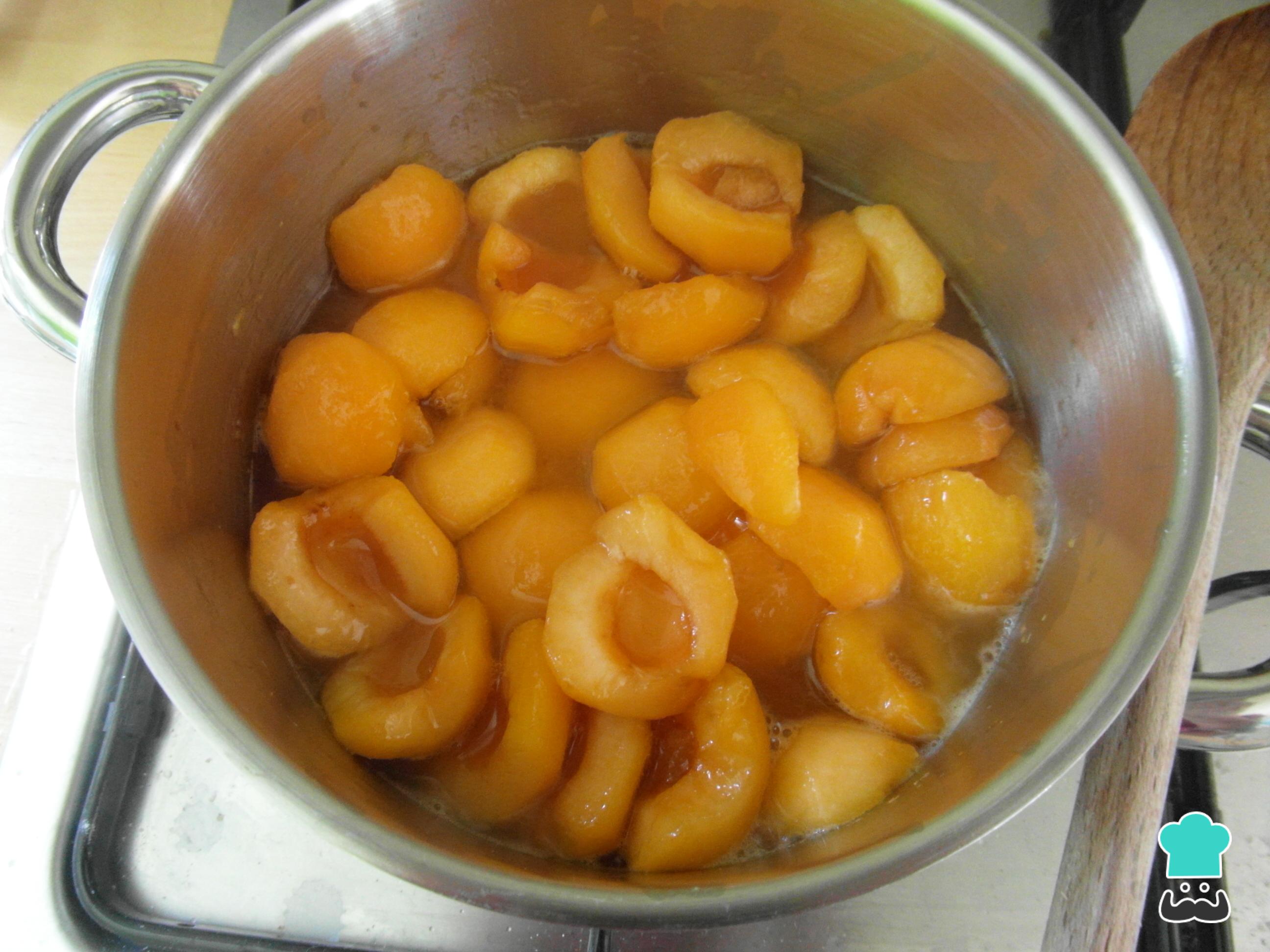 Após esse tempo coloque os damascos numa panela com a água, e cozinhe em fogo médio sem tampar. À medida que cozinha, vá retirando com uma colher a espuma que se forma (isso é importante para que a consistência final da geleia seja heterogênea).