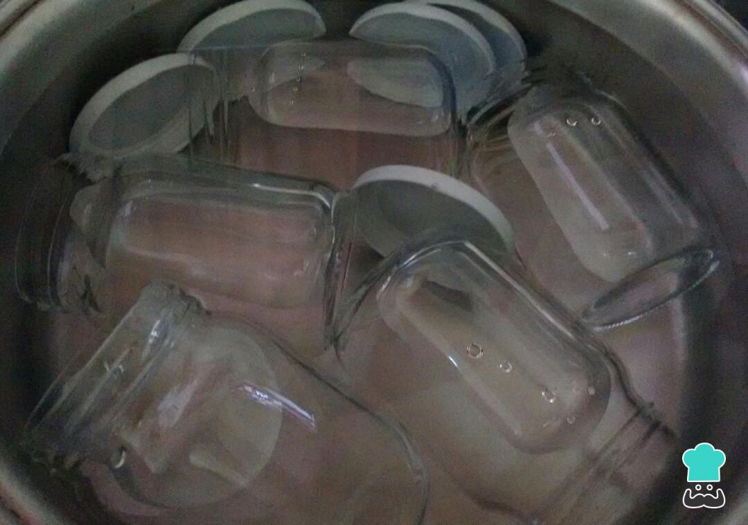 A preparação dos vidros para conservar a geleia é feita do seguinte jeito: coloque os vidros e tampas para ferver, após levantar fervura baixe o fogo e deixe por 45 minutos. Em seguida, com exceção das tampas, leve os potes ao forno médio por 20 minutos, para secar.