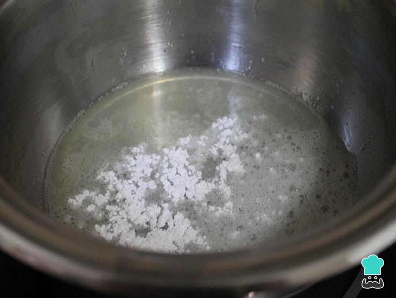 Após os 5 minutos de fervura, junte a mistura da goma xantana e mexa vigorosamente com a ajuda de um fouet, para desfazer os grumos.