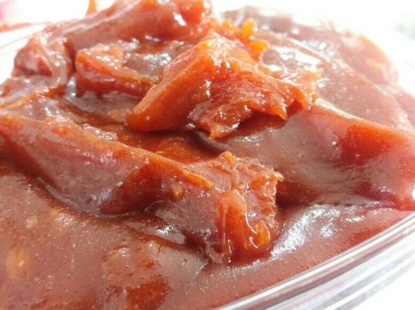 O ponto da geleia: coloca-se uma colher na geleia e levanta de lado, se ela estiver pingando ainda não está no ponto. Vai verificando até que em vez de pingos começa a cair placas. Com a prática se identifica se quer uma geleia pastosa ou de corte.