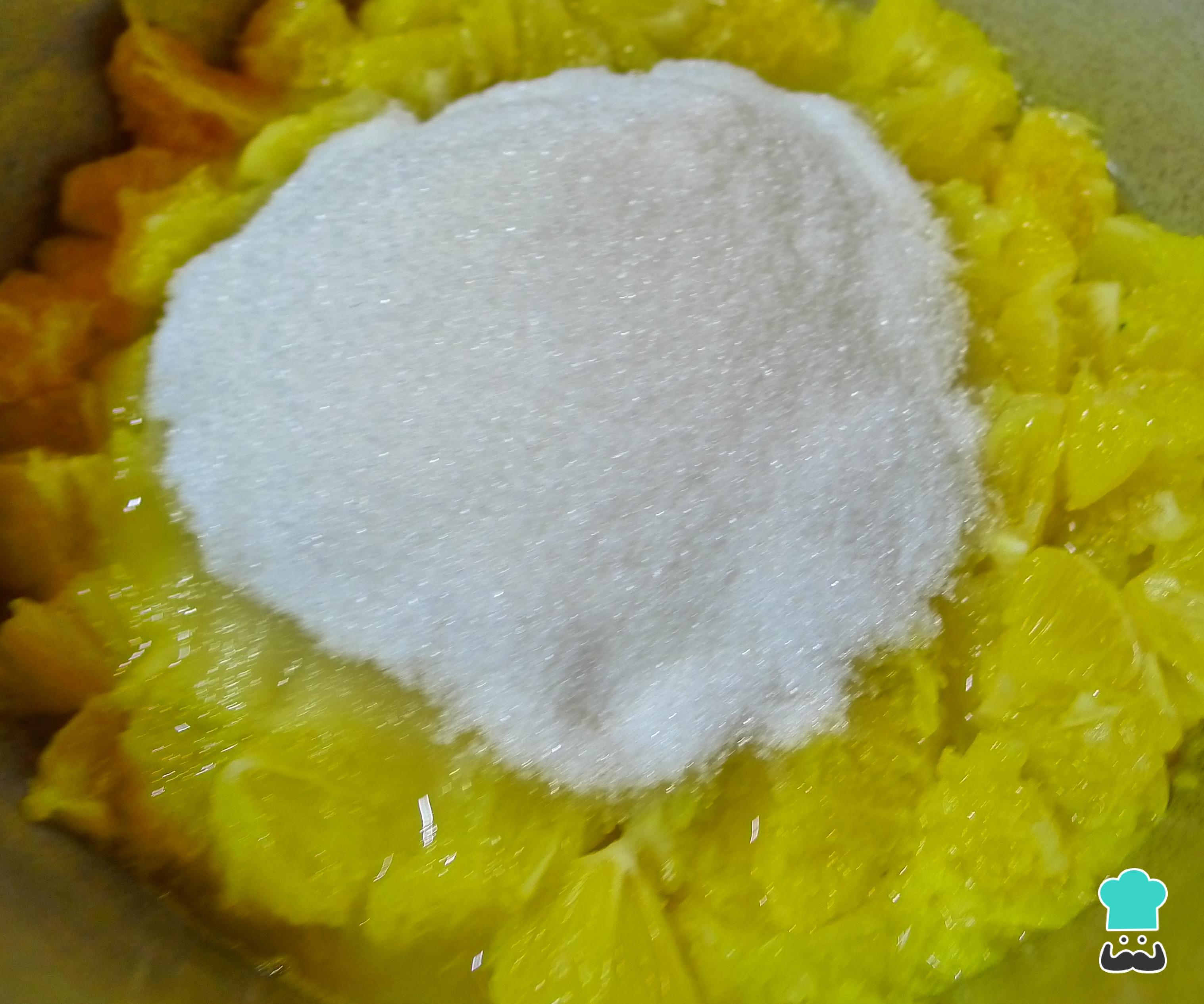 Após o passo anterior, adicione as laranjas, o suco de limão e o açúcar, e misture tudo.