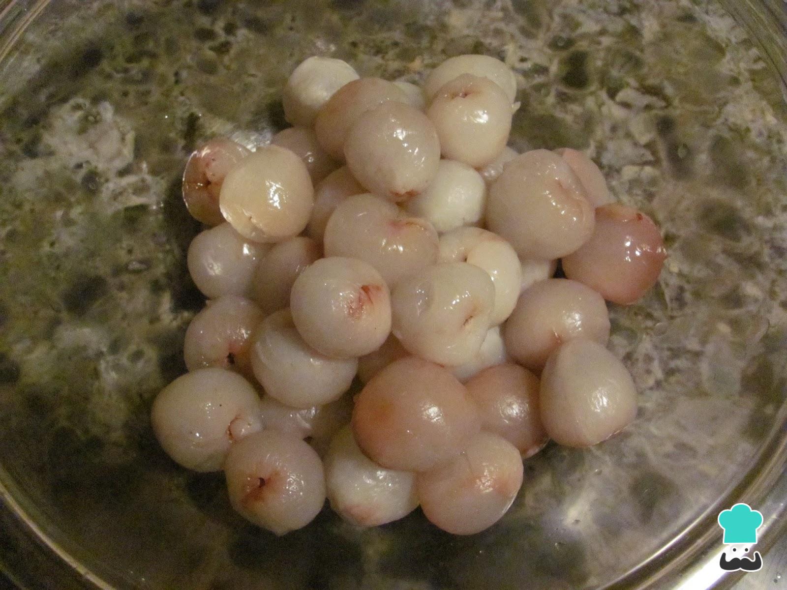 Para fazer geleia de lichia, comece por descascar a fruta. Retire as sementes e separe a polpa.