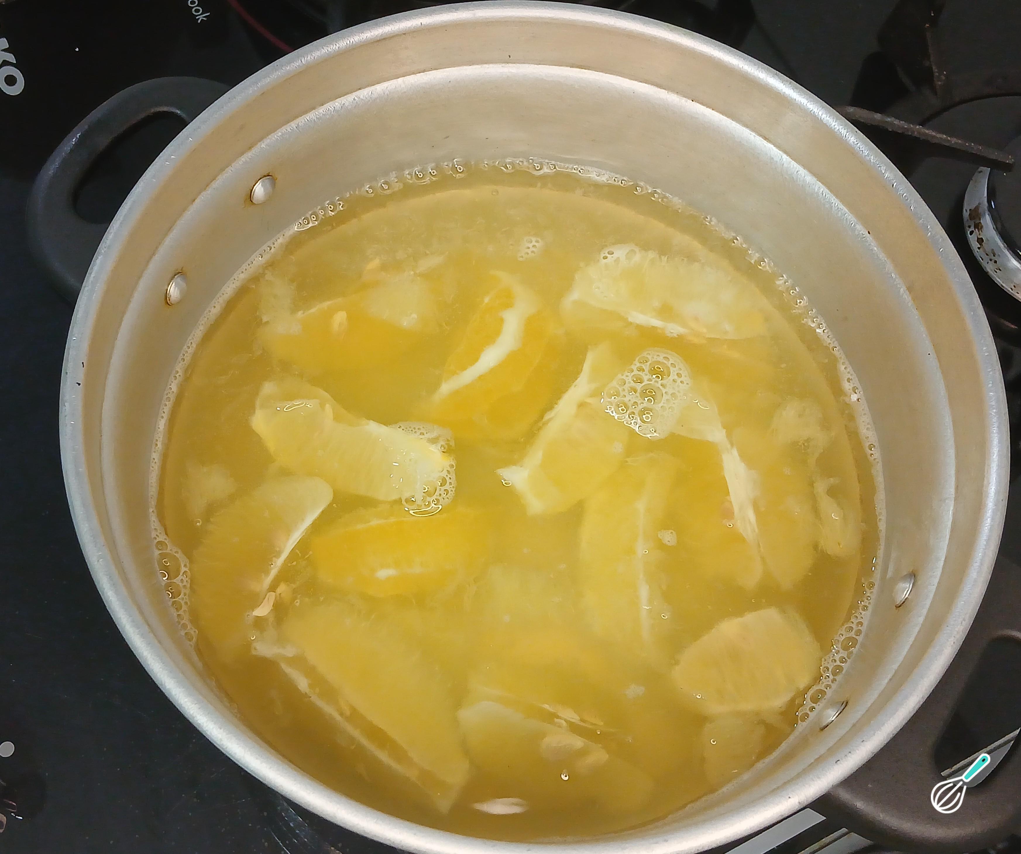 Dica: A etapa de ferver as cascas é opcional. Faça se preferir sabores mais ácidos e acentuados. Se gostar de sabores mais delicados e docinhos passe para a etapa seguinte.