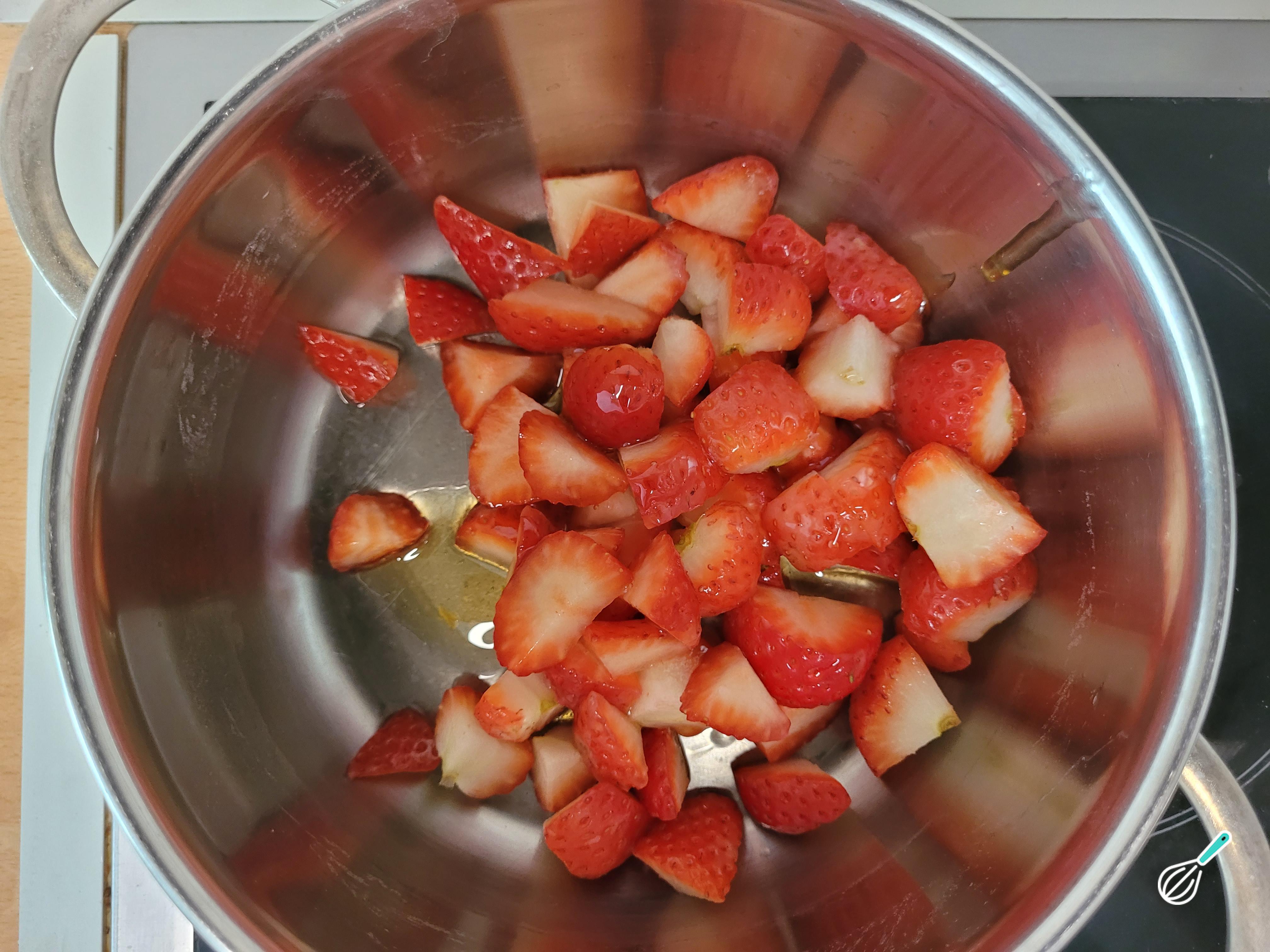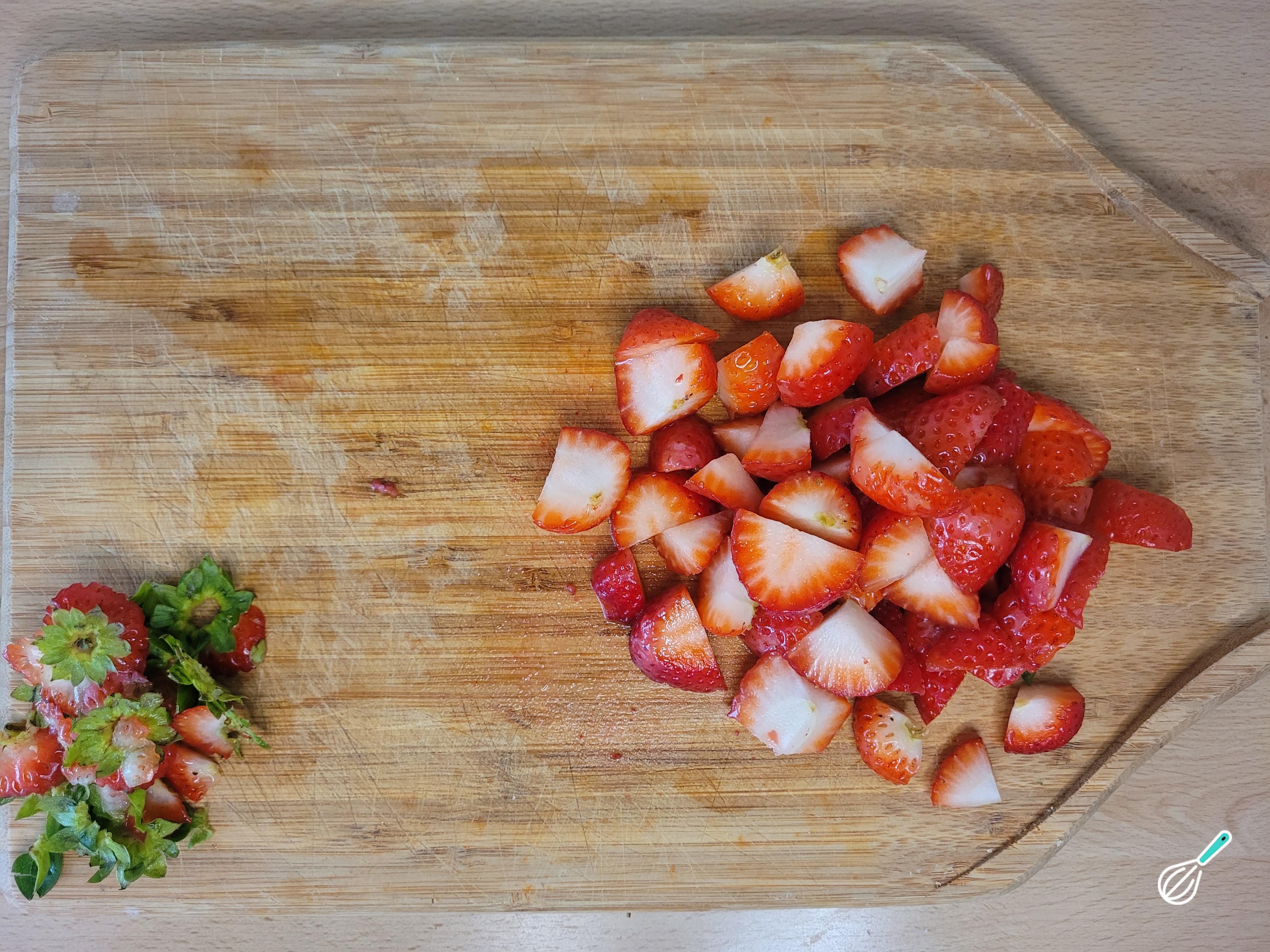 Depois de lavar e secar bem os morangos, tire as folhinhas e corte em pedaços pequenos. Quanto menor você cortar, mais rápido eles irão se desfazer na panela.