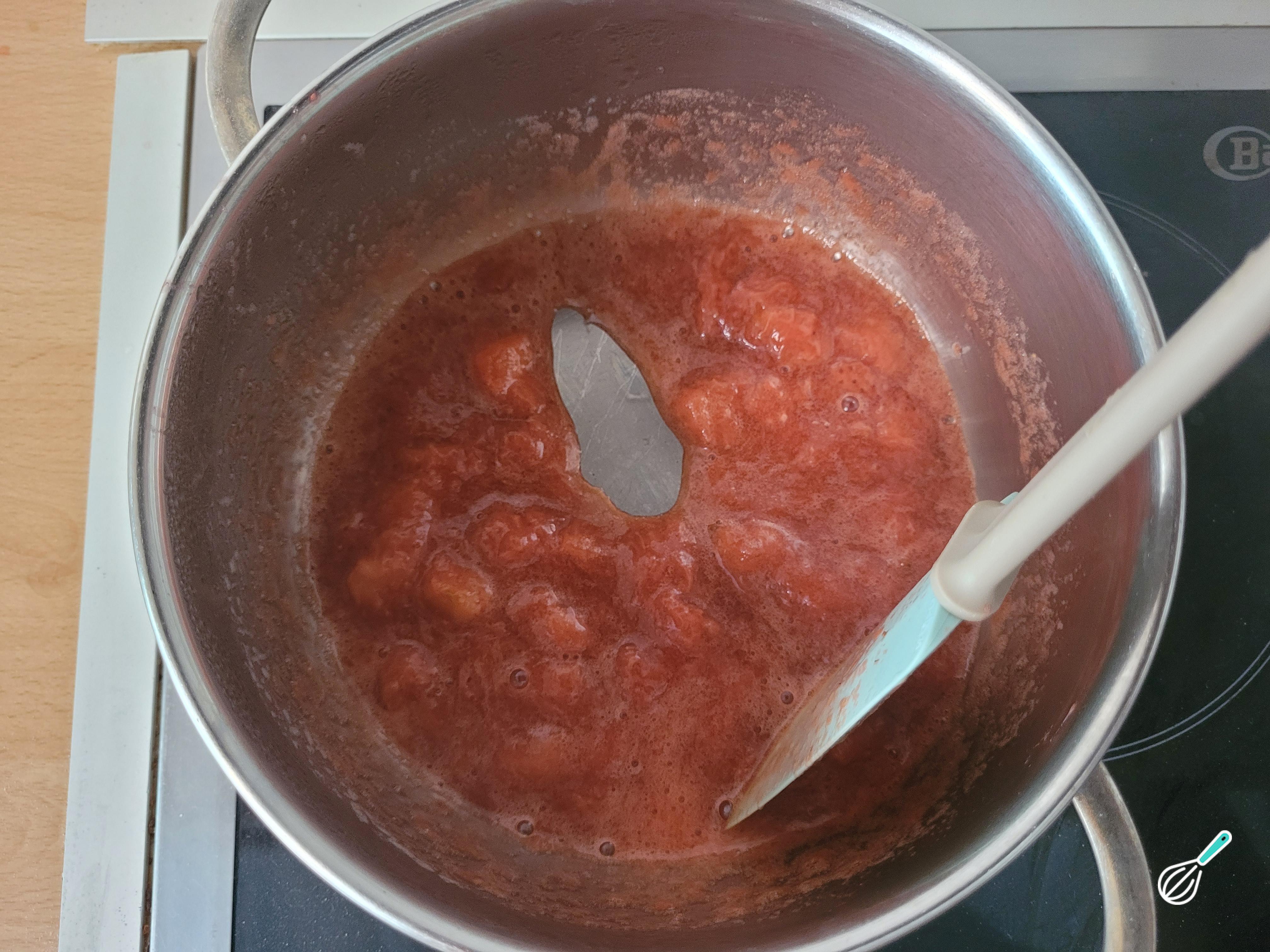 Ligue o fogo médio e quando começar a borbulhar abaixe o fogo. Deixe em fogo baixo mexendo sempre para não grudar no fundo da panela. Vá pressionando os morangos para que eles se desmanchem.
