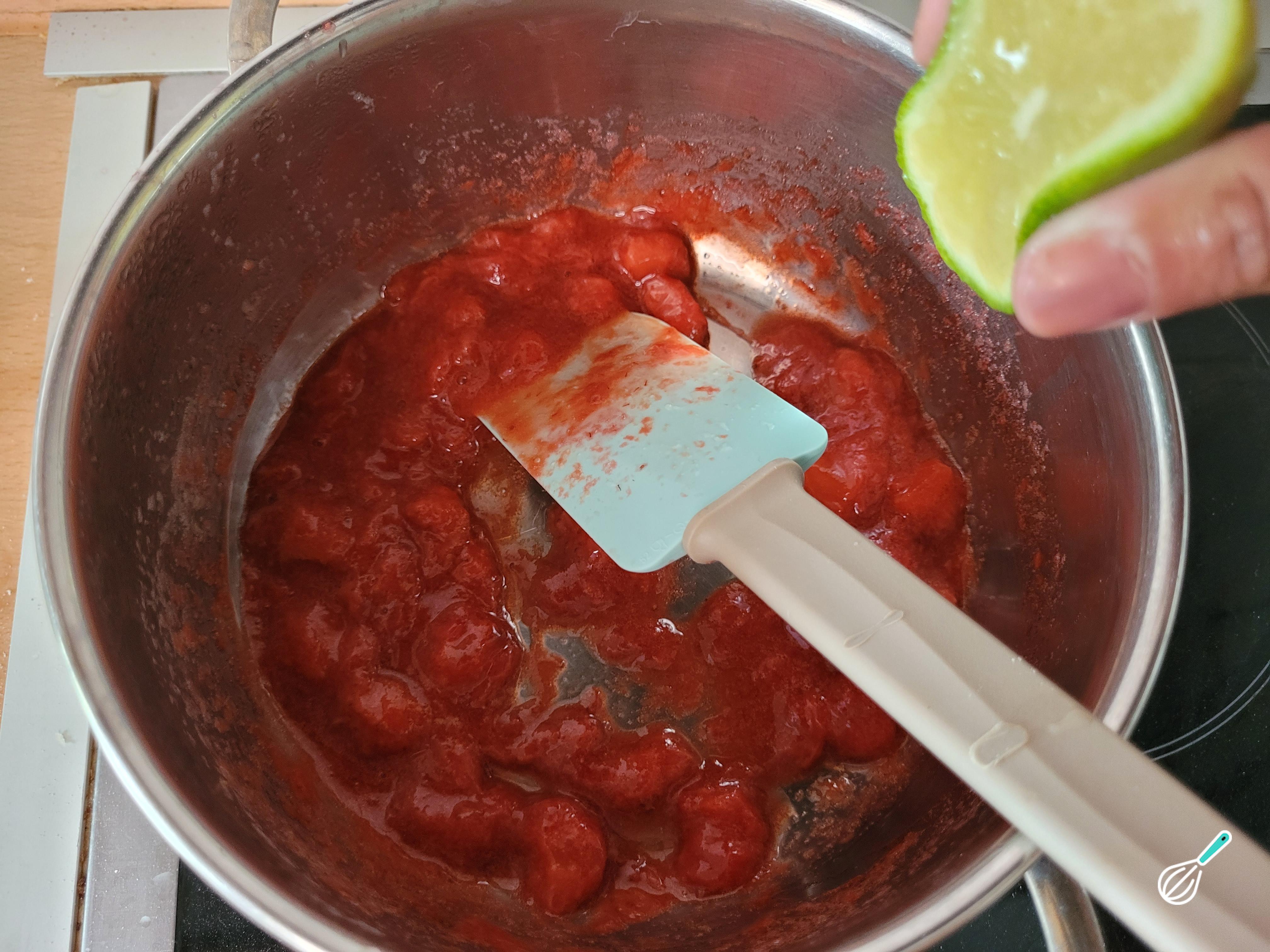 Quando os morangos estiverem desmanchados e a geleia na consistência desejada, finalize com umas gotinhas de suco de limão.