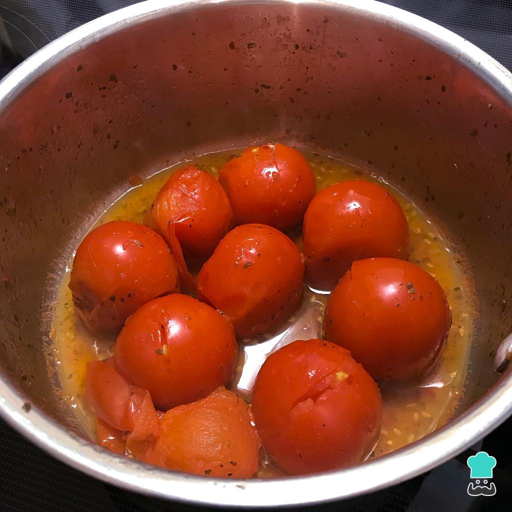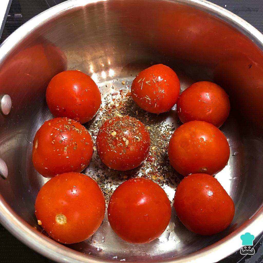 Em seguida cozinhe os tomates por uns 5 minutos ou até eles ficarem macios, abrirem e soltarem o suco.