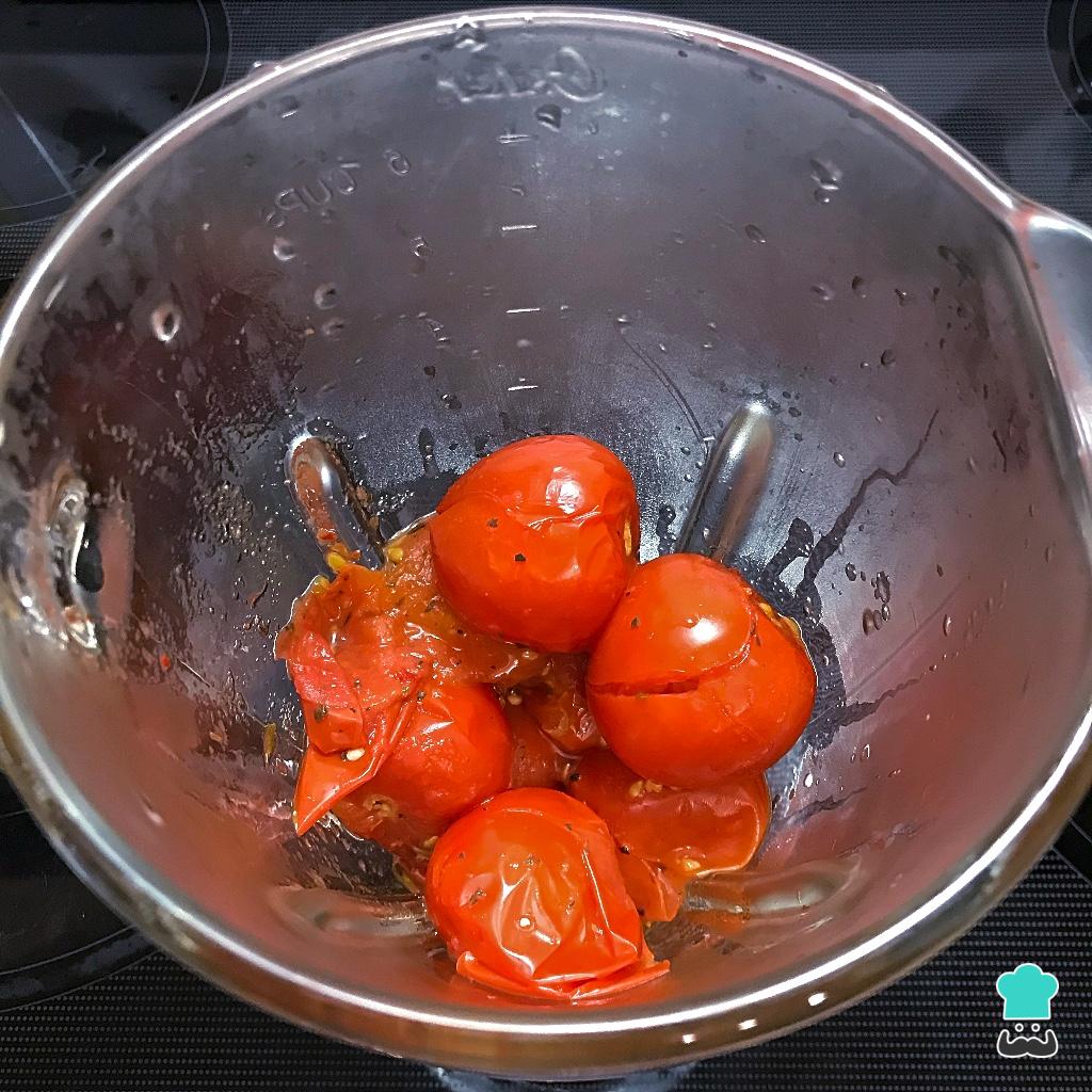 O passo seguinte desta geleia de tomate é passar os tomates e seu suco para o liquidificador e bater até ficarem bem homogêneos.