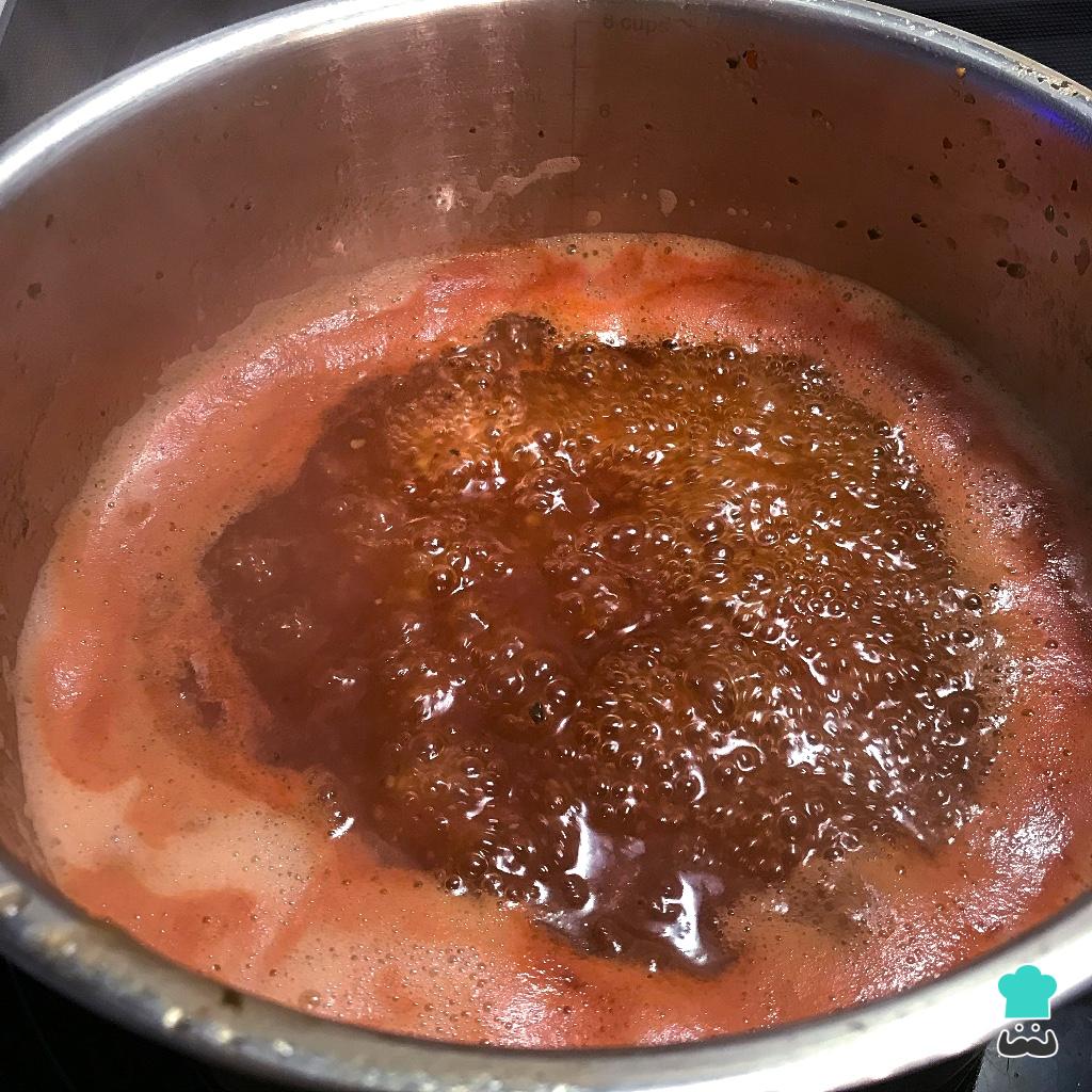 Assim que a mistura reduzir e ficar bem pegajosa, estará pronta sua geleia de tomate com pimenta calabresa! A consistência deve ser igual a da foto (depois que esfria ele engrossa mais).