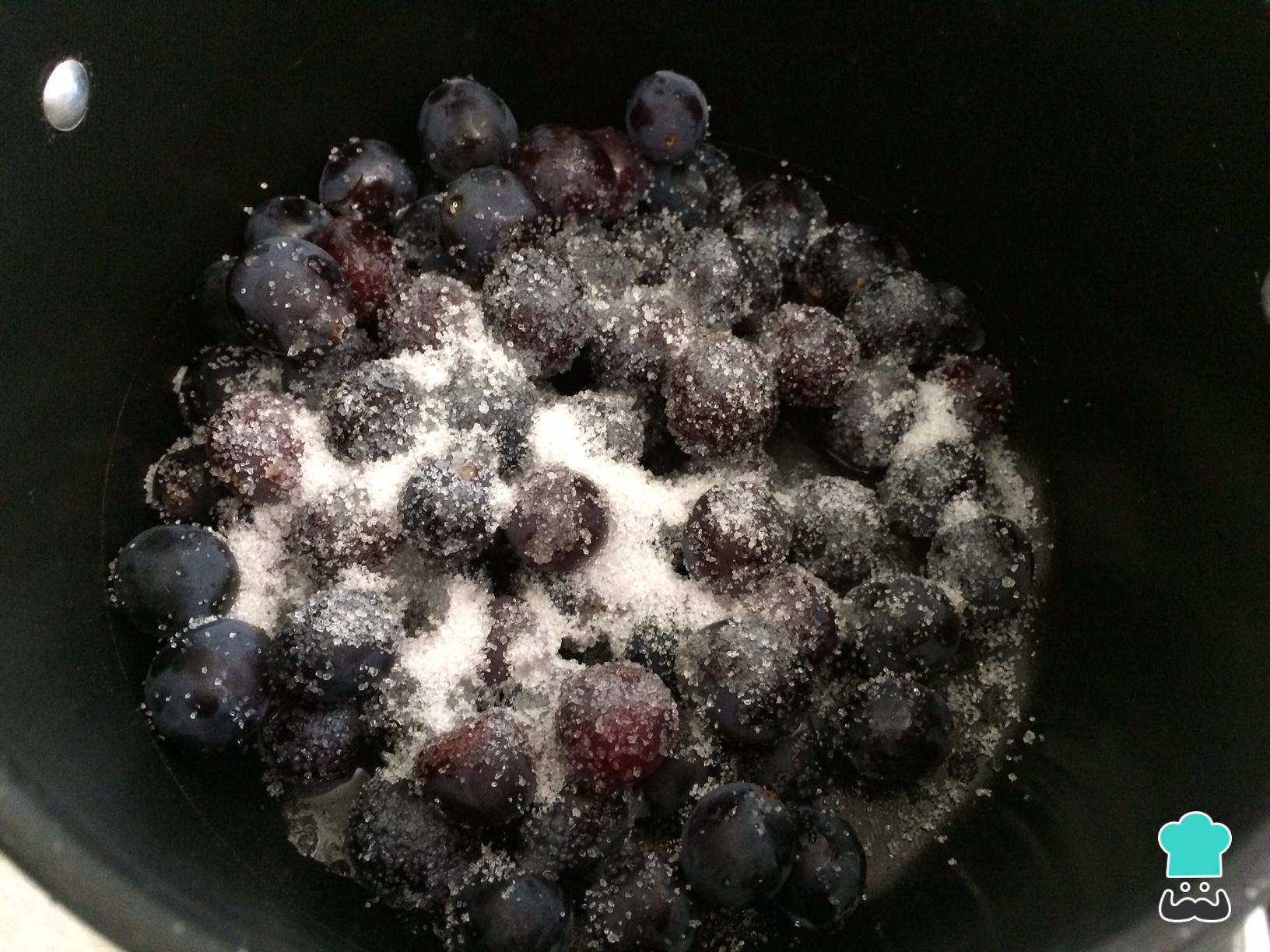 Coloque as uvas lavadas e com a casca em uma panela, junte o açúcar e o suco de limão e misture.