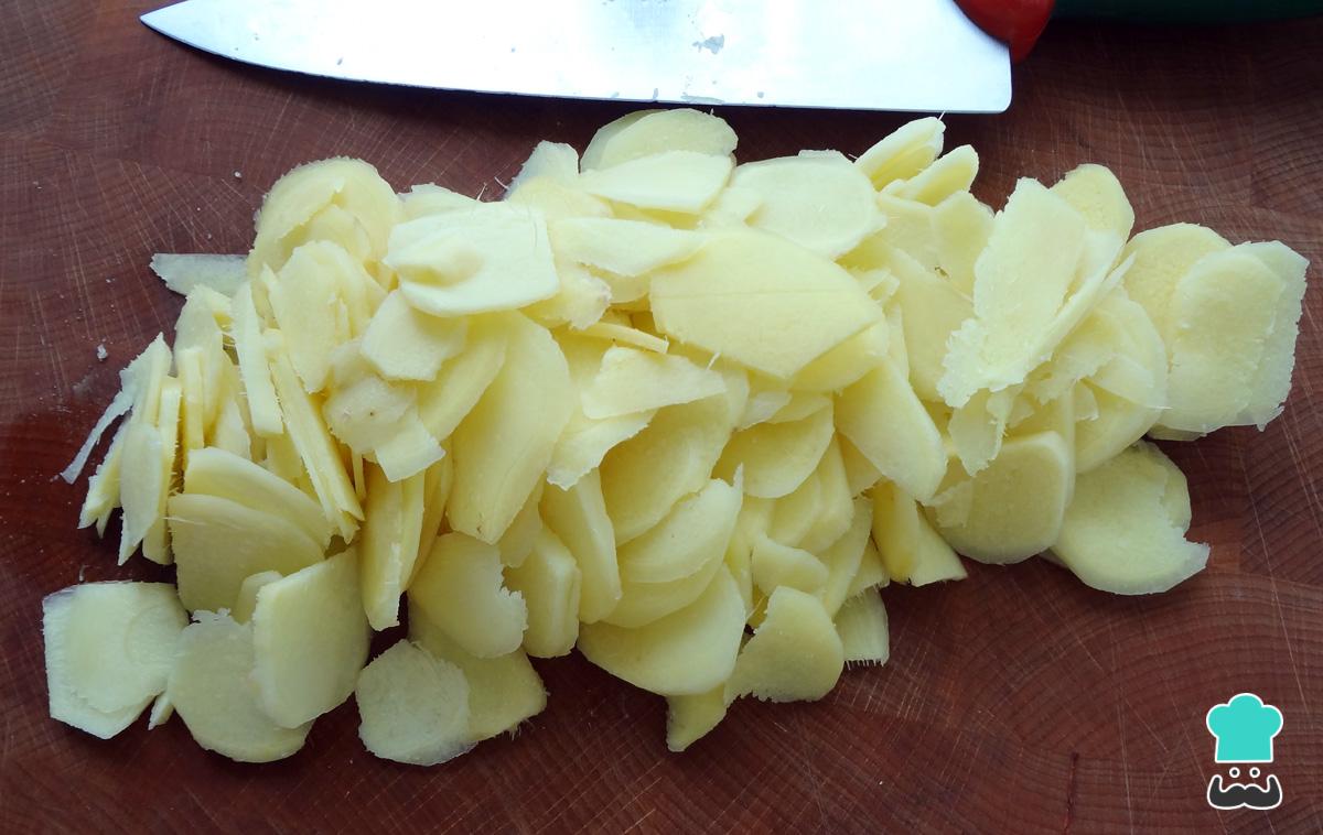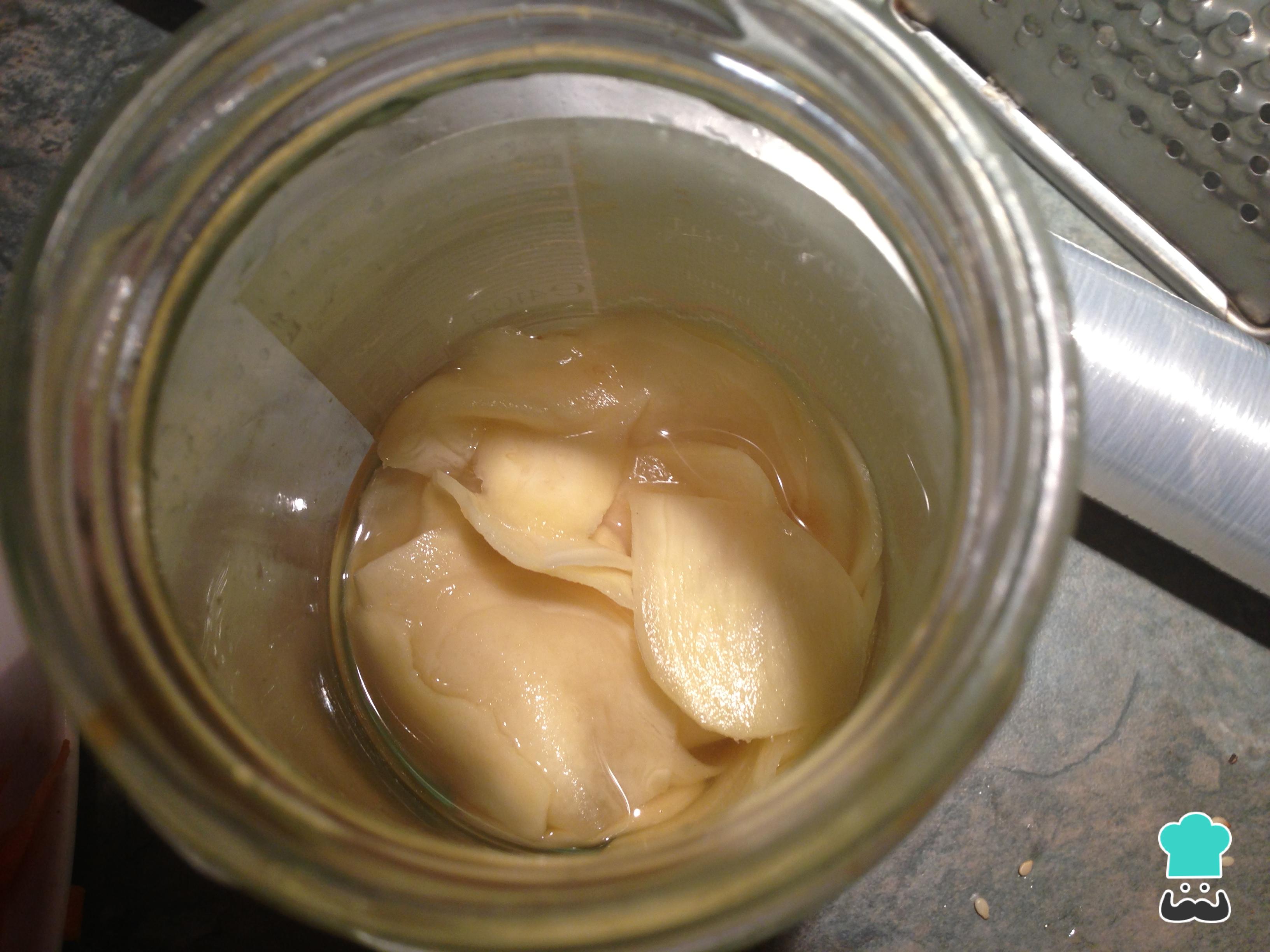É bem simples fazer gengibre em conserva! O primeiro passo é descascar o gengibre e cortar em fatias, de preferência com uma mandolina ou descascador de legumes.