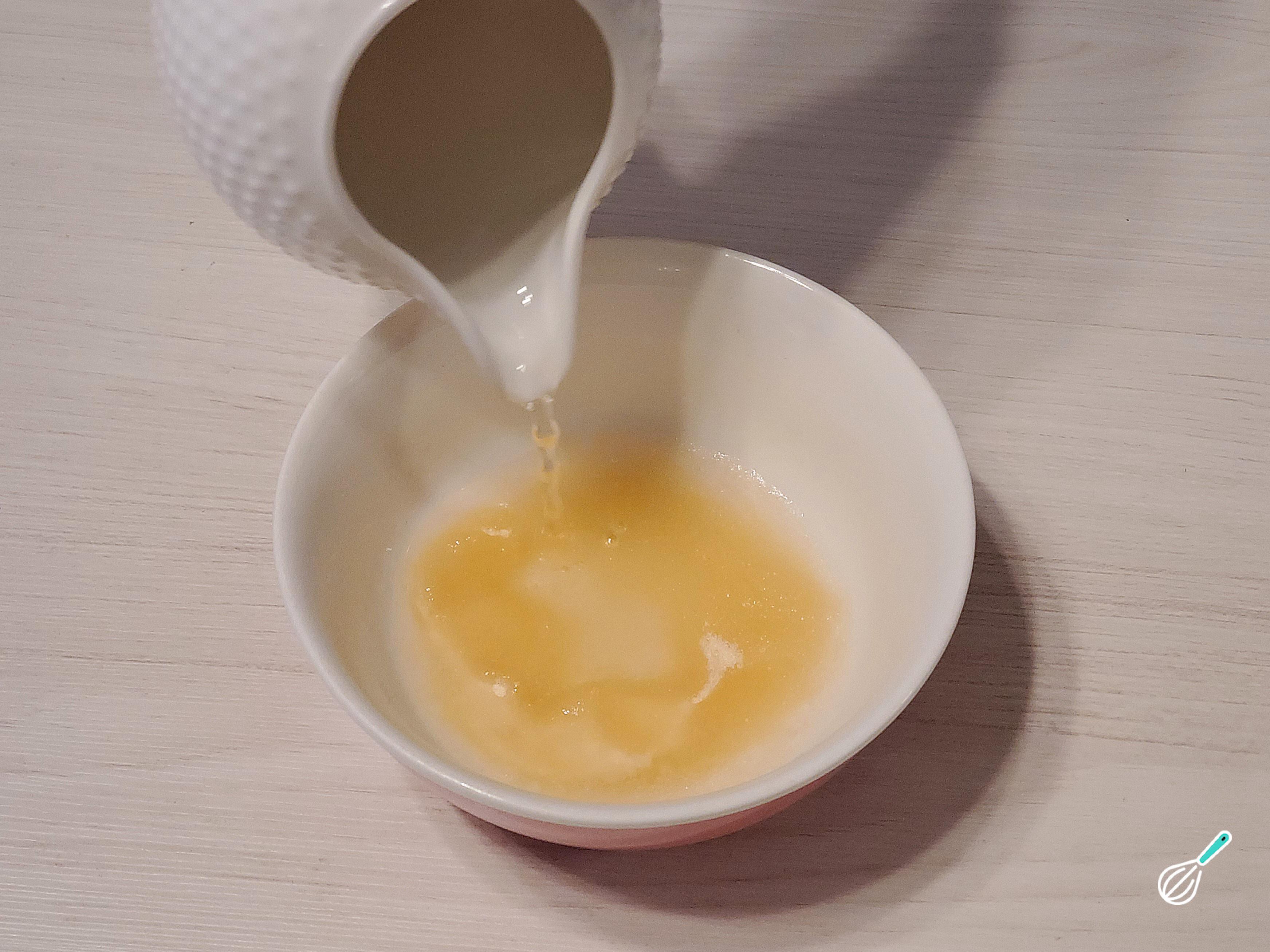 Comece preparando a gelatina neutra em pó. Para fazer isso, coloque os 9 gramas de gelatina em uma tigela pequena e despeje 54 gramas de água fria sobre ela, misture um pouco sem formar bolhas e deixe descansar por pelo menos 10 minutos.