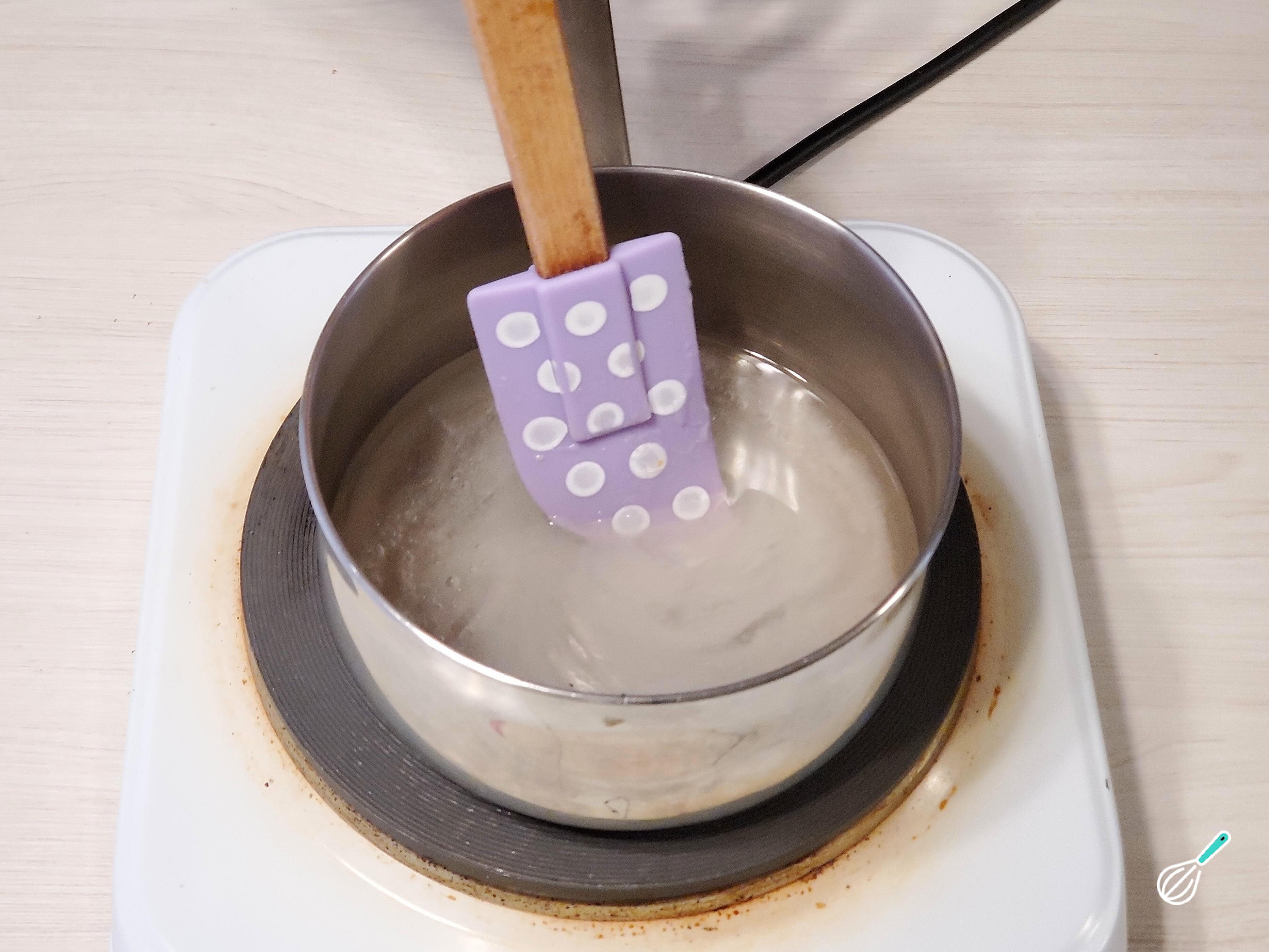 Comece despejando o açúcar, a água e a glicose em uma panela. Leve ao fogo médio-baixo e mexa até que a glicose esteja completamente diluída. À medida que a mistura esquentar, a glicose vai se diluindo cada vez mais. Deixe levantar fervura.