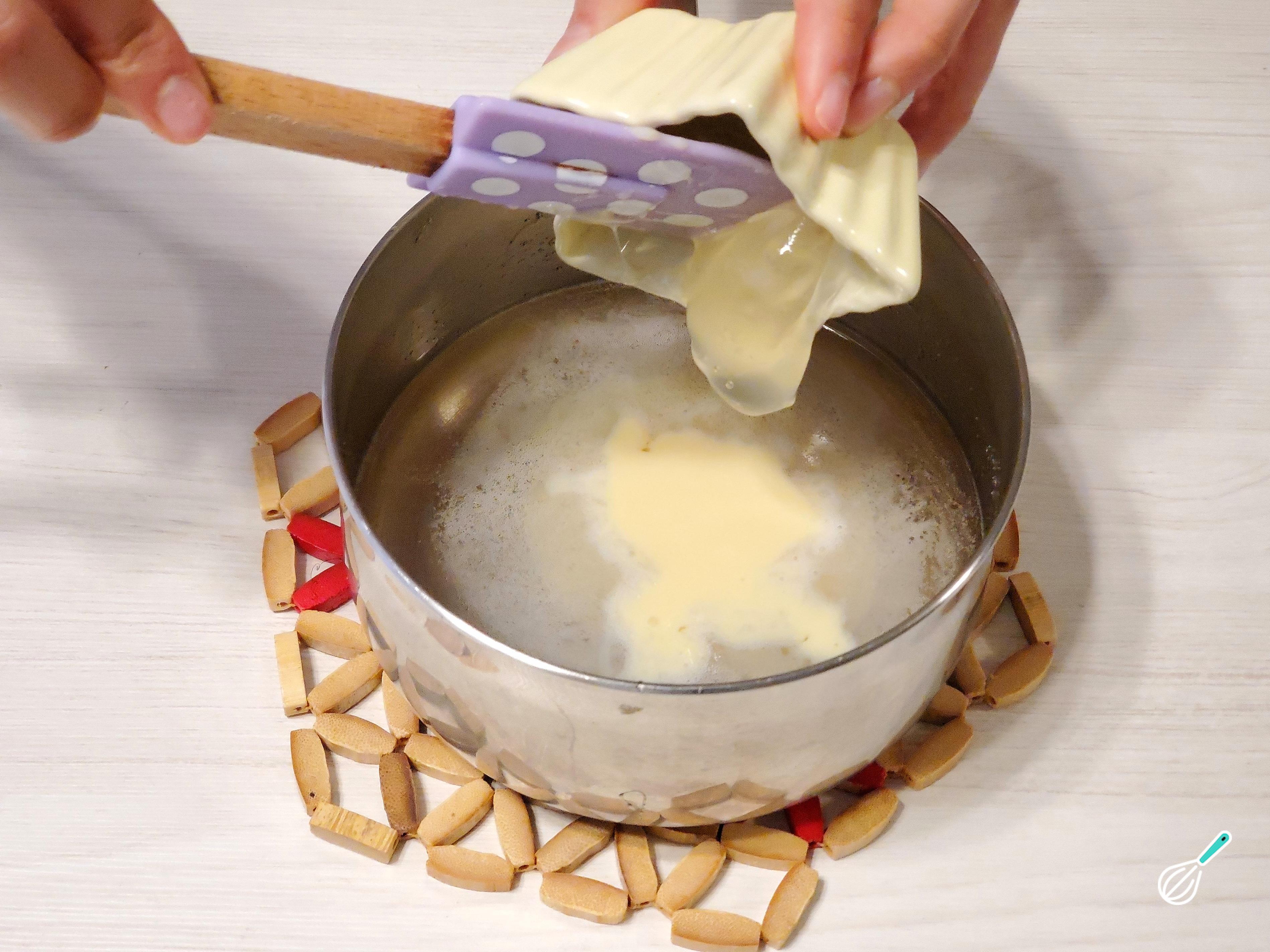 Retorne ao fogo e mexa a cobertura de chocolate espelhado até que esses ingredientes estejam completamente diluídos. Deixe ferver durante 1 minuto antes de apagar.